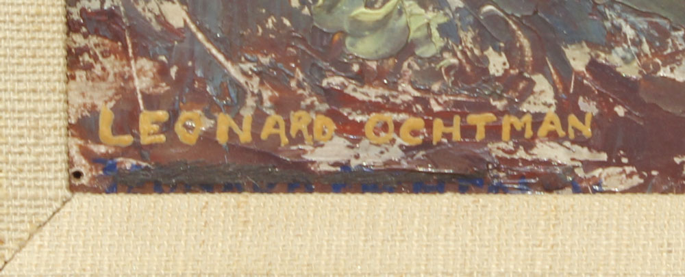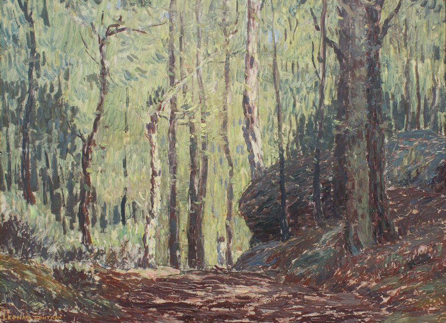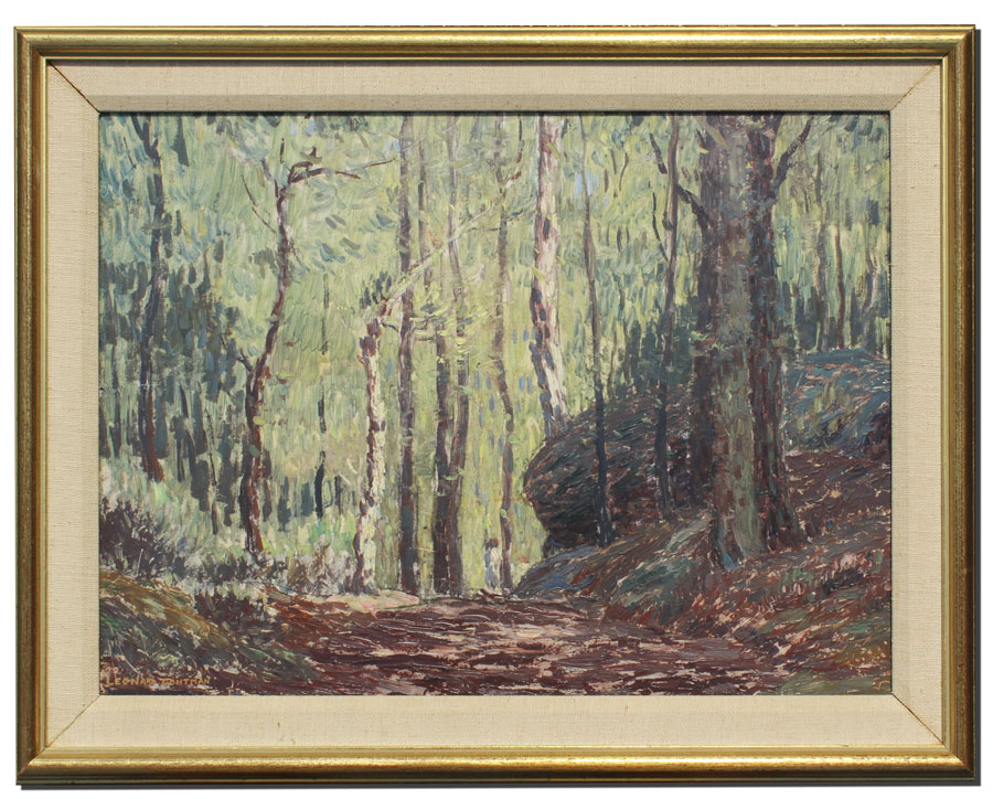 OCHTMAN, Leonard, (American, 1854-1934): Figures Traveling Along a Wooded Path, Oil/Wood Panel, 12'' x 16'', signed lower left, later gilded frame, 15'' x 19''.