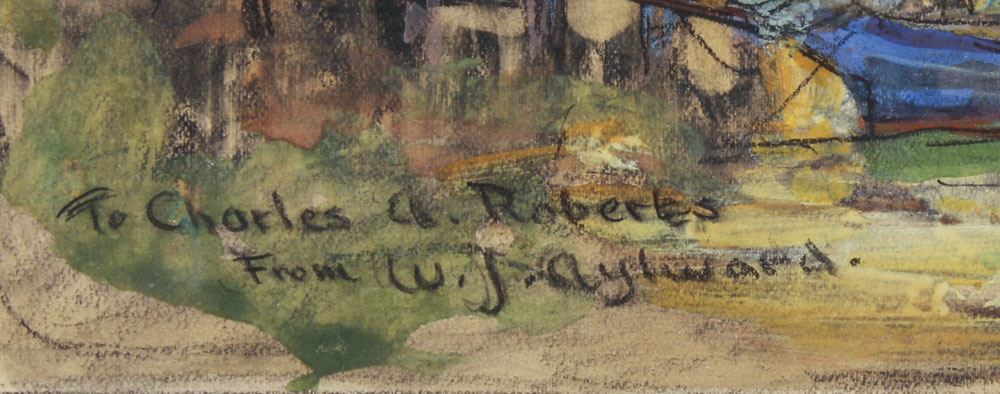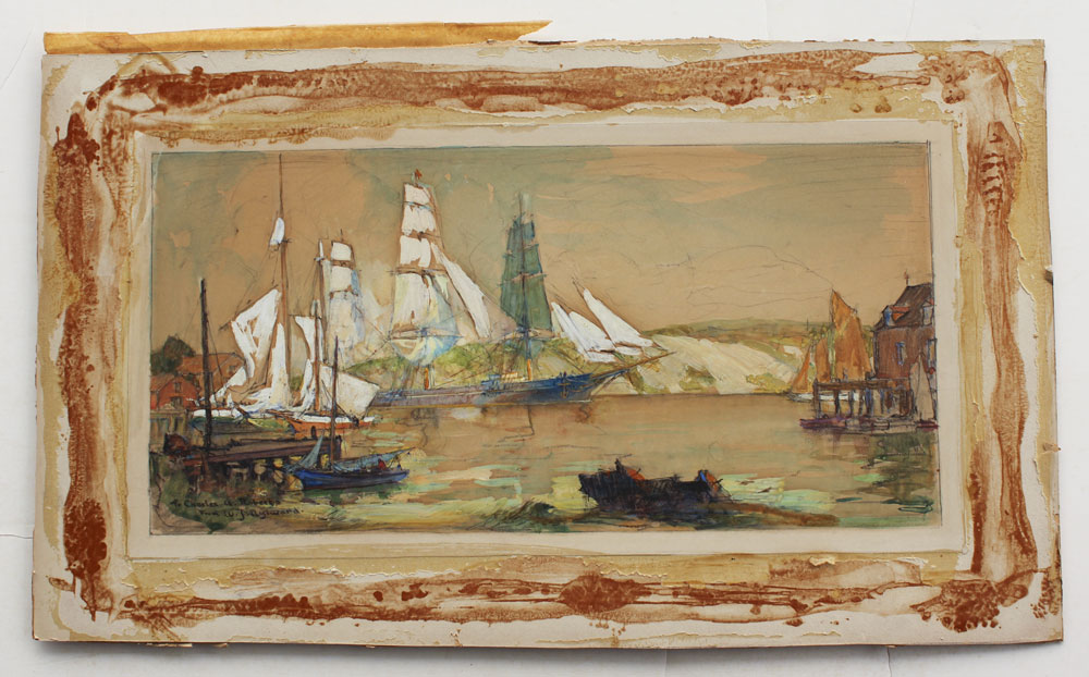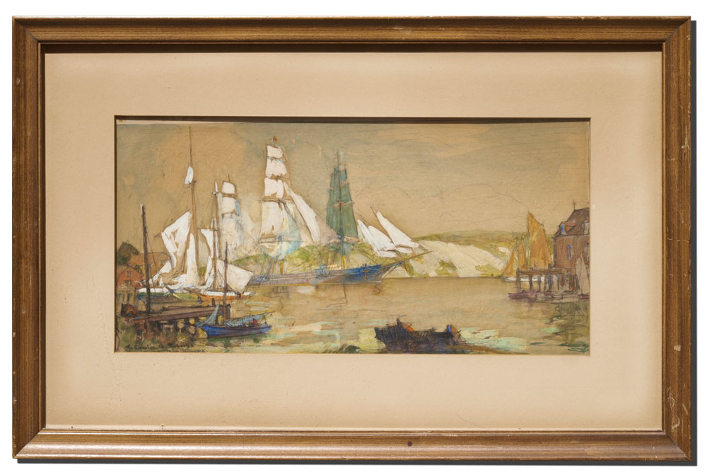 AYLWARD, William James, (American, 1875-1958): Dockside Nautical Scene, Watercolor/Gouache on paper, sight size 8 1/4'' x 16 3/4'', signed and dedicated to Charles A Roberts lower left, framed, 15 1/4'' x 24''.