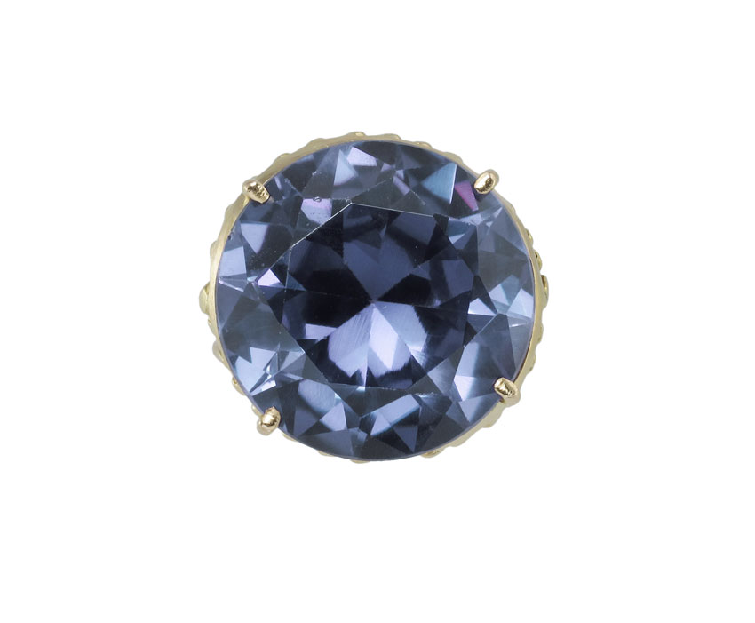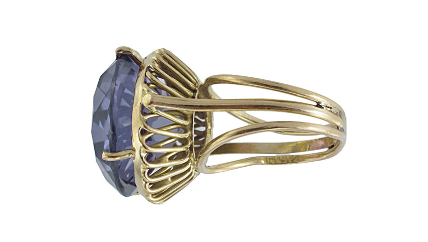 20K GOLD CHANGING COLOR SAPPHIRE RING: 20K yellow gold ring contains one round 17.00 mm synthetic color-change sapphire. Mounting weight: 5.6 grams. approx. Size: 4.5