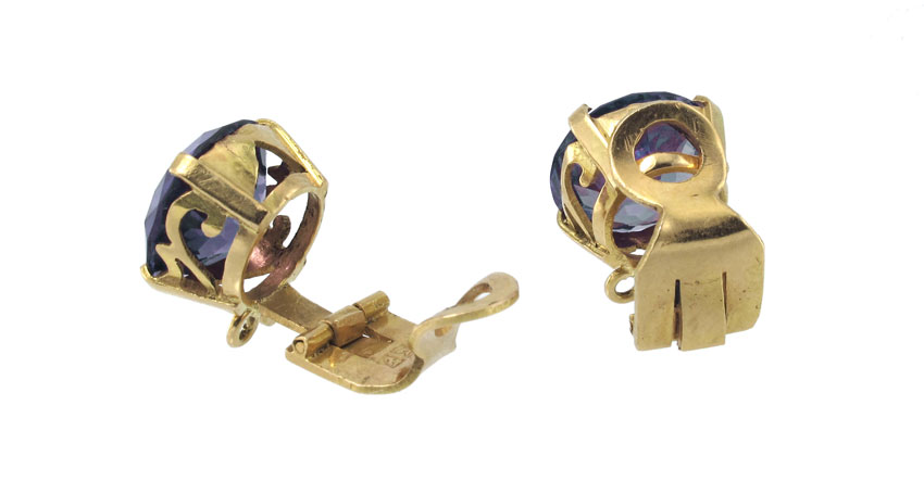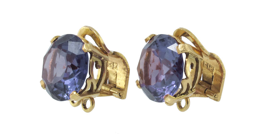 20K GOLD CHANGING COLOR SAPPHIRE EARRINGS: 20K yellow gold earrings contain two round 12.00 mm synthetic color-change sapphires. Hinged clip closure. Mounting weight: 6.7 grams. approx.