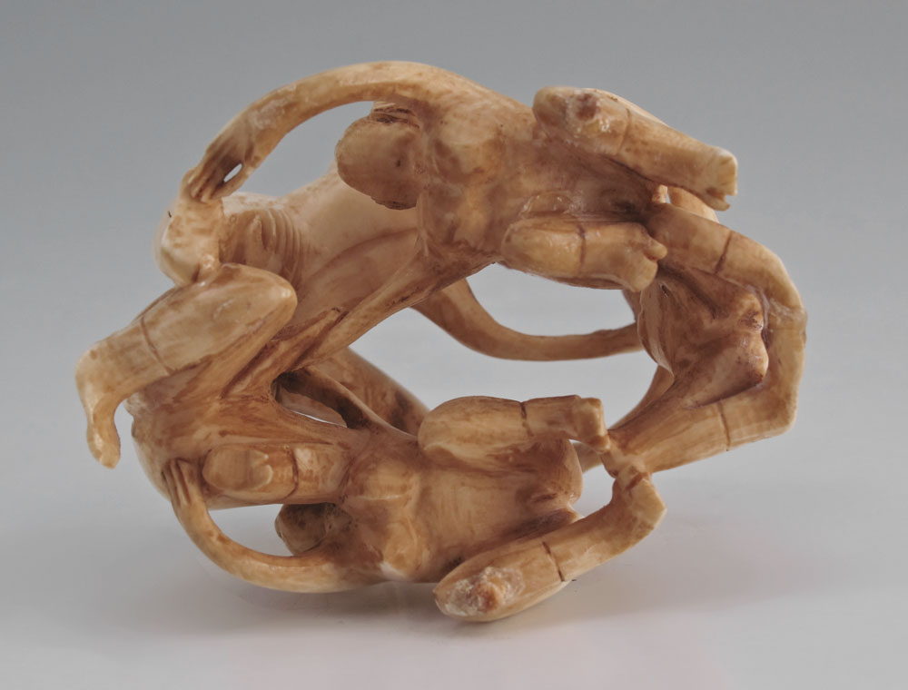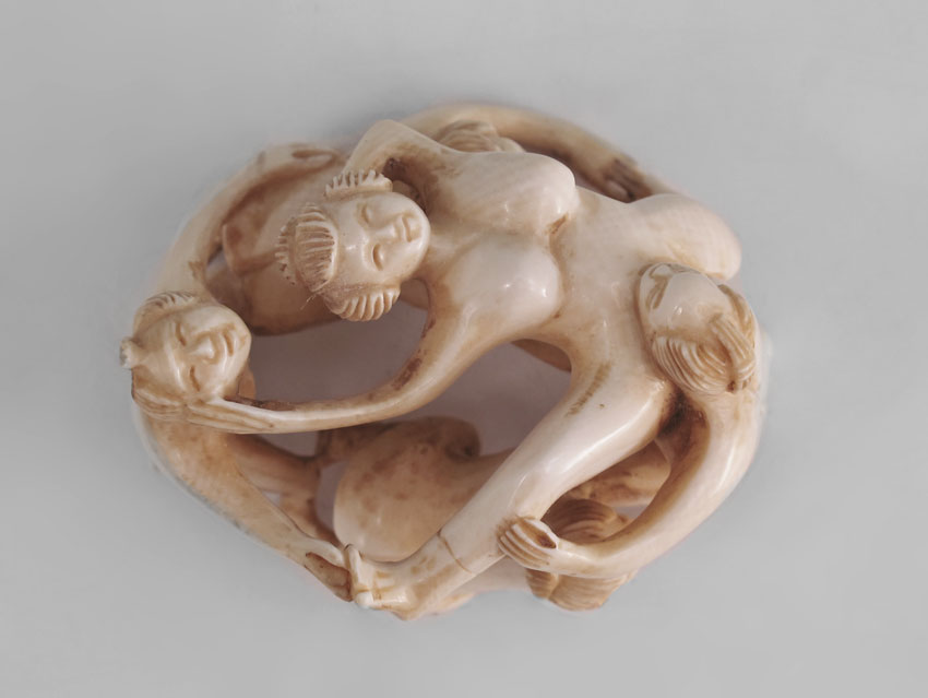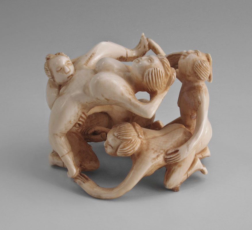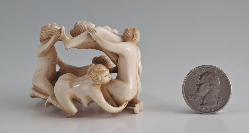 EROTIC CARVED IVORY FIGURAL GROUP: Group of 3 women and 2 men in salacious positions, unsigned. 1 3/4'' h. x 2 1/4''.