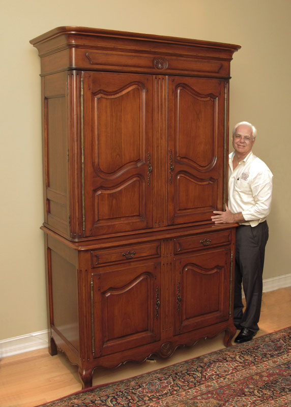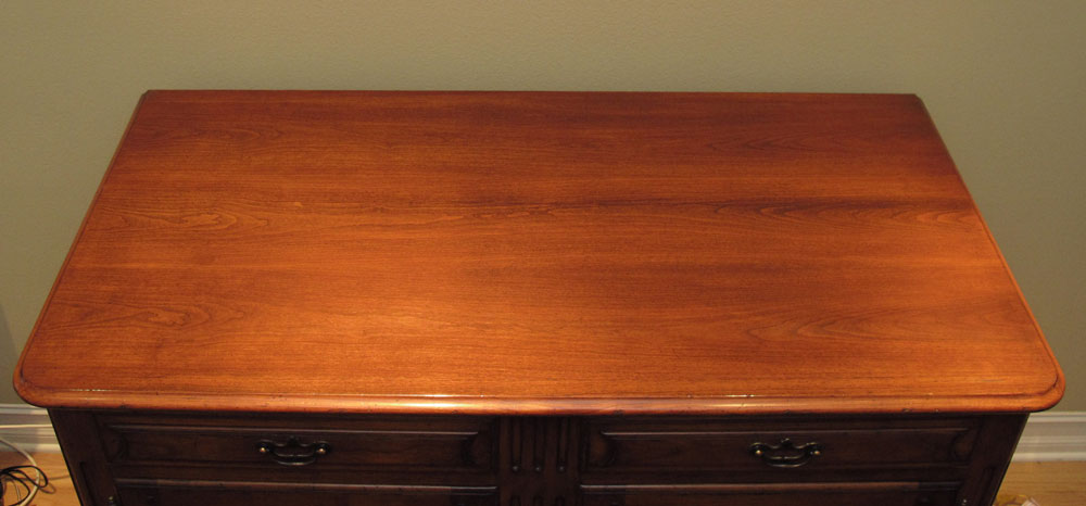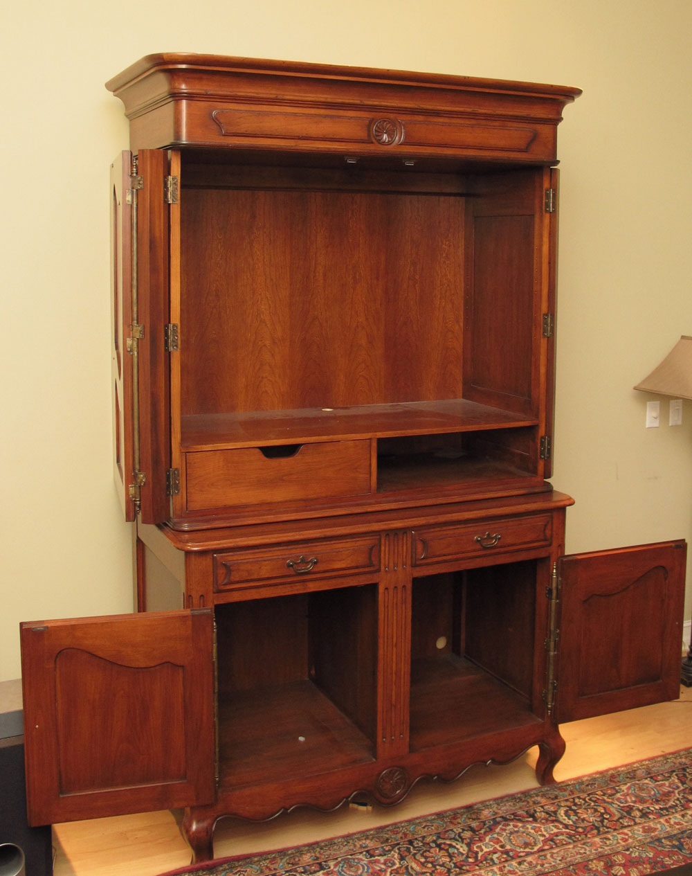 CENTURY FURNITURE 2 PIECE CHERRY ENTERTAINMENT CENTER: 2 door top with carved panels opens to reveal tv shelf over drawer and cubbyhole for electronics. 2 drawer over 2 door base with shaped skirt on 4 legs. Separate top and bottom sections, overall 93'' h. x 53 1/2'' x 28''.