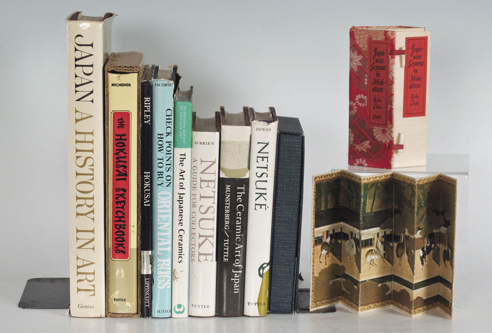 10 JAPANESE ART AND NETSUKE REFERENCE BOOKS: 10 books on Japanese culture, art, and reference to include 1) The Fifty-Three Stages of Tokaido by Ando Hiroshige, Miniature Edition. 2) Japanese Screens in Miniature by Reiko Chiba. 3) The Hokusai Sketchbooks by James Michener, original slipcase. 4) The Ceramic Art of Japan by Hugo Munsterberg. 5) The Art of Japanese Ceramics by Tsugio Mikami. 6) Netsuke by F. M. Jonas. 7) Netsuke, A Guide for Collectors by Mary Louise O'Brien. 8) Hokusai, A Biography by Elizabeth Ripley. 9) Japan, A History in Art by Bradley Smith. 10) How to Buy Oriental Rugs by Charles Jacobsen.