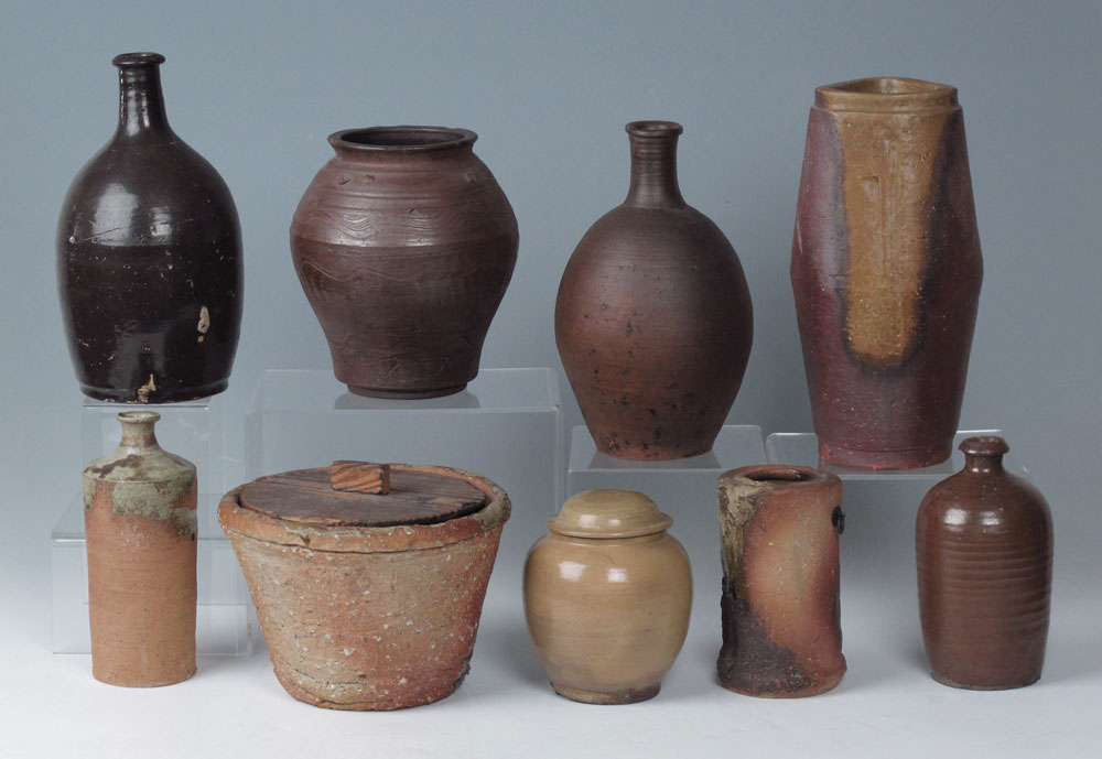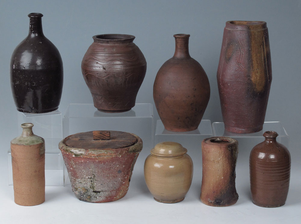 9 PC JAPANESE POTTERY BOTTLES, WATER VESSEL, COVERED JAR: Utilitarian vessels to include vases, water vessel with wood cover, bottles. The tallest being the vase, 12'' tall.