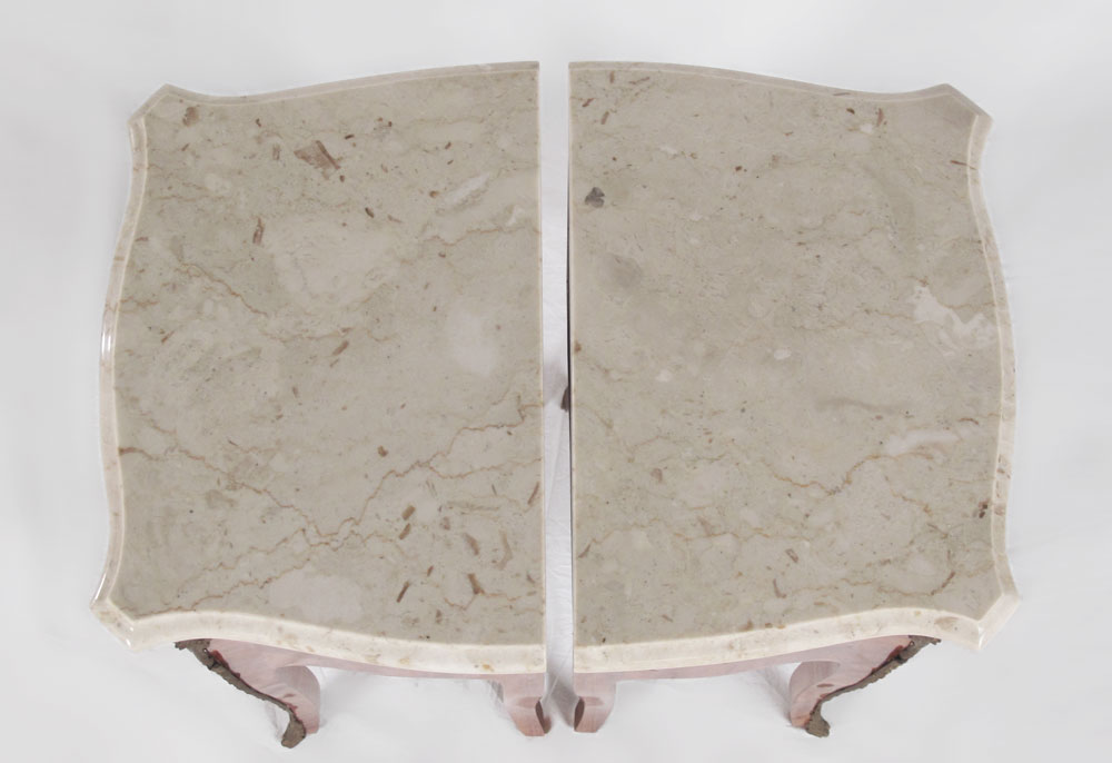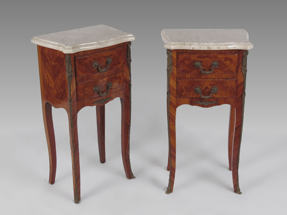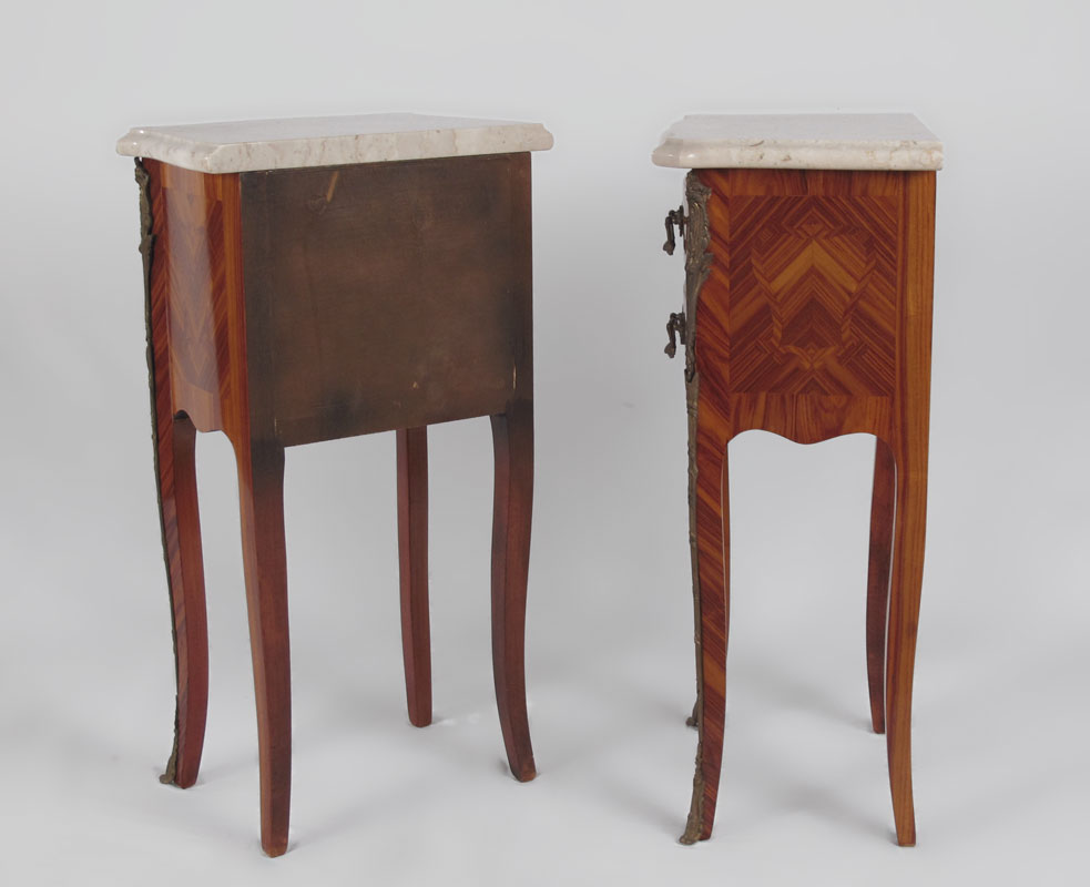 PAIR OF ORMOLU MOUNTED FRENCH STYLE STANDS: Variegated white marble tops over 2 drawers. Parquetry inlaid with ormolu mounts on front legs. 28 1/4'' h. x 15 1/4'' x 10 3/4''.