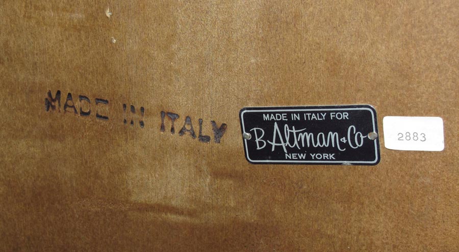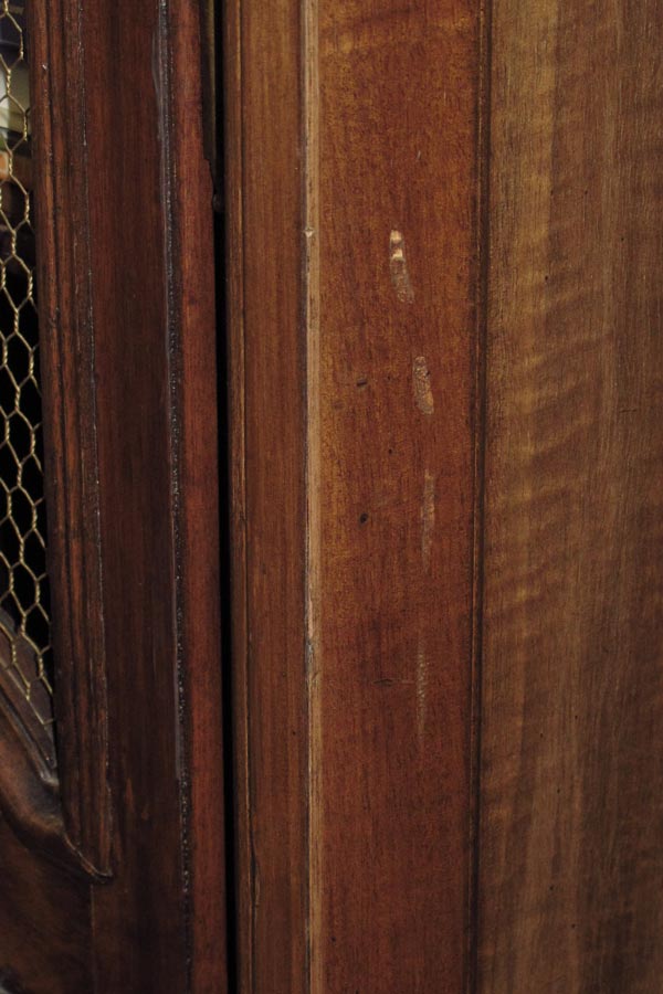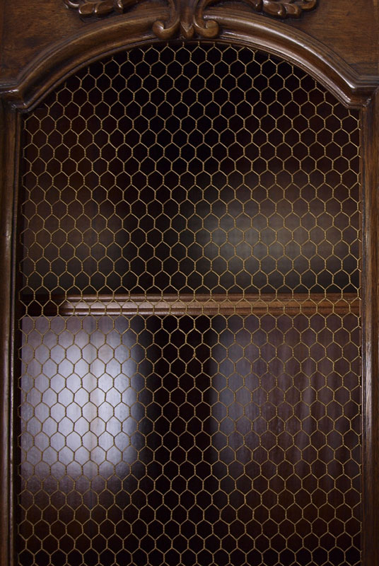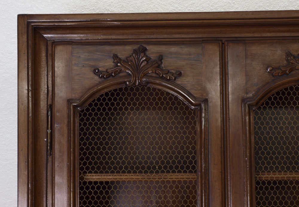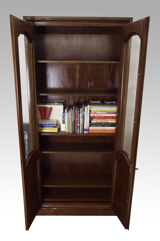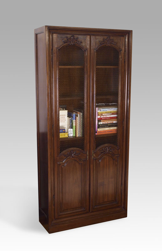 ITALIAN MESH FRONT BOOKCASE CABINET FOR B. ALTMAN: Walnut double door cabinet, upper doors with wire mesh. The interior has 6 adjustable height shelves. Paneled sides. Made in Italy stamp, retailer B. Altman retailer metal label. Approx. 79'' tall x 36'' x 14''.
