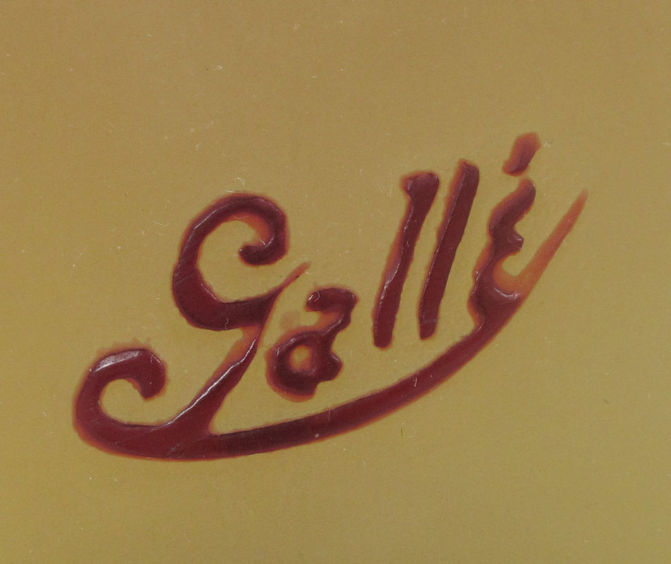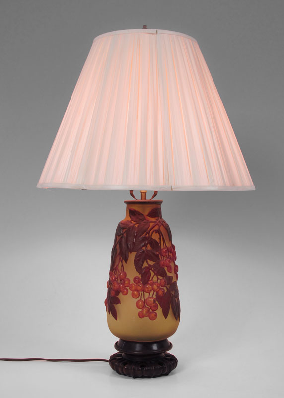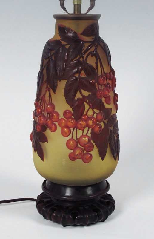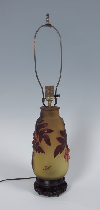 GALLE FRENCH ART NOUVEAU CAMEO GLASS LAMP: Deepest red cut to light green. Signed in Cameo. The glass is approx. 10'', the lamp being 26'' tall overall.