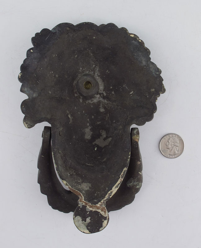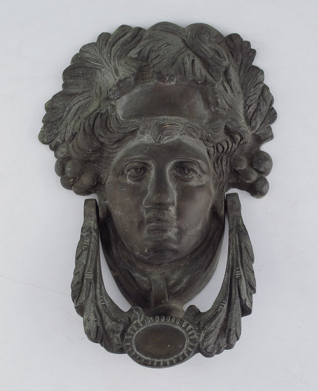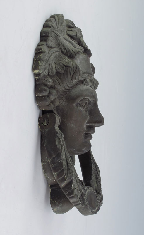 19TH C. BRONZE MAIDEN'S HEAD MASQUERON DOOR KNOCKER: 7'' h x 5 1/4'' w.