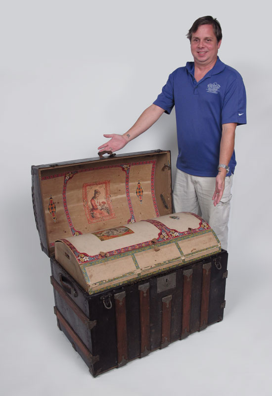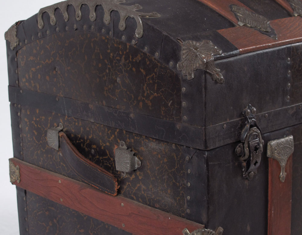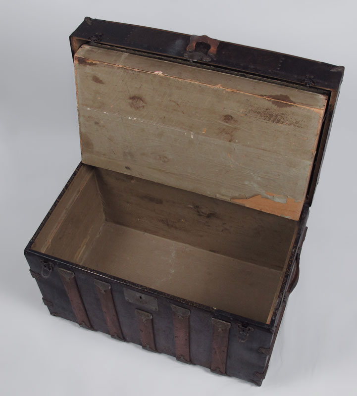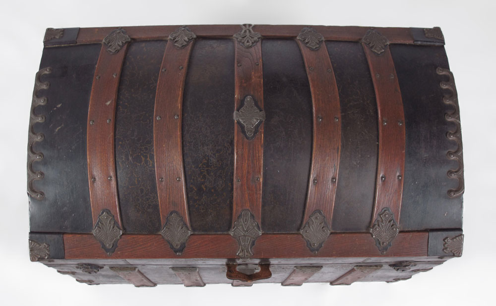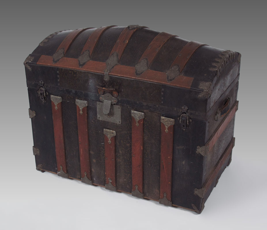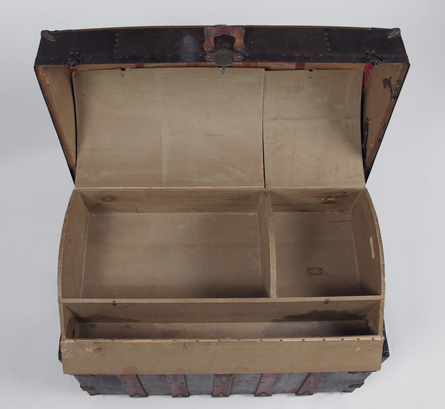 ANTIQUE WOOD BOUND CAMEL BACK TRUNK: Opens to reveal compartmented insert with decoupage decoration, measures 26 1/2'' h. x 34 1/4'' x 20''. No key.