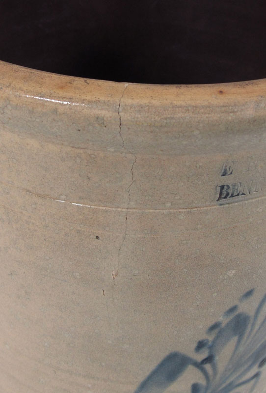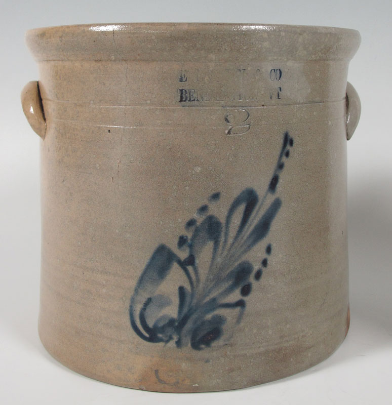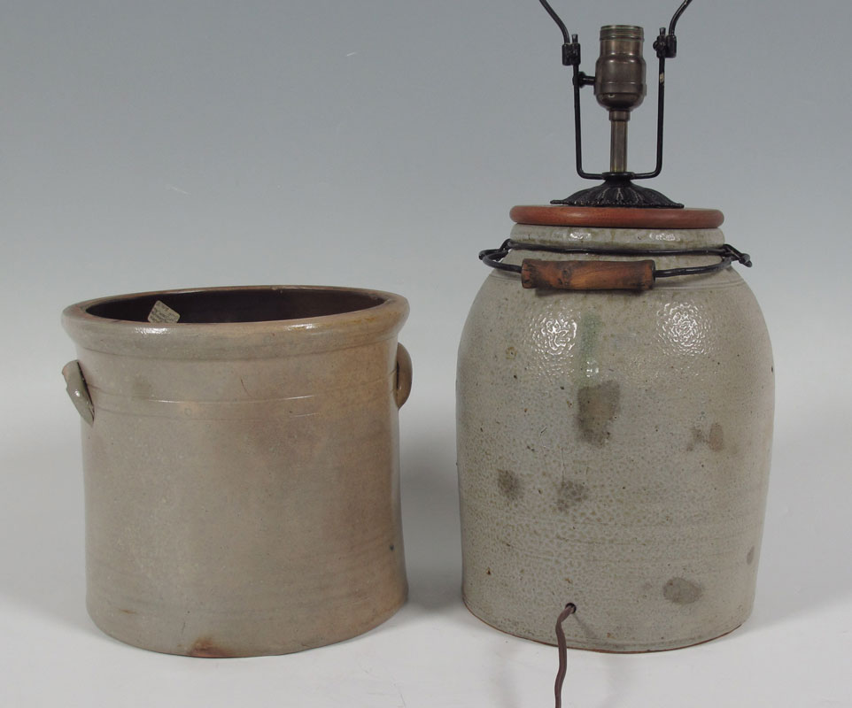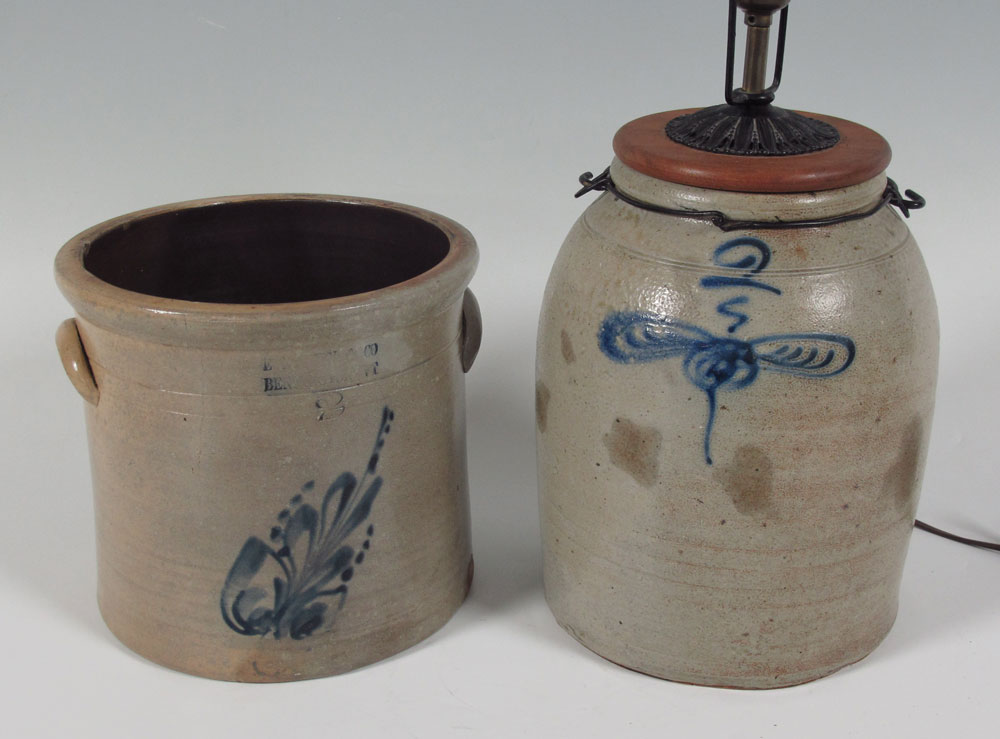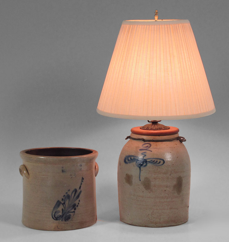 E. NORTON STONEWARE CROCK SOLD WITH CROCK / LAMP: E. Norton of Bennington VT cobalt decorated 2 gallon crock, 9'' tall x 10'' dia. Sold together with a cobalt decorated 2 gallon jug converted to a lamp, unmarked as to maker.