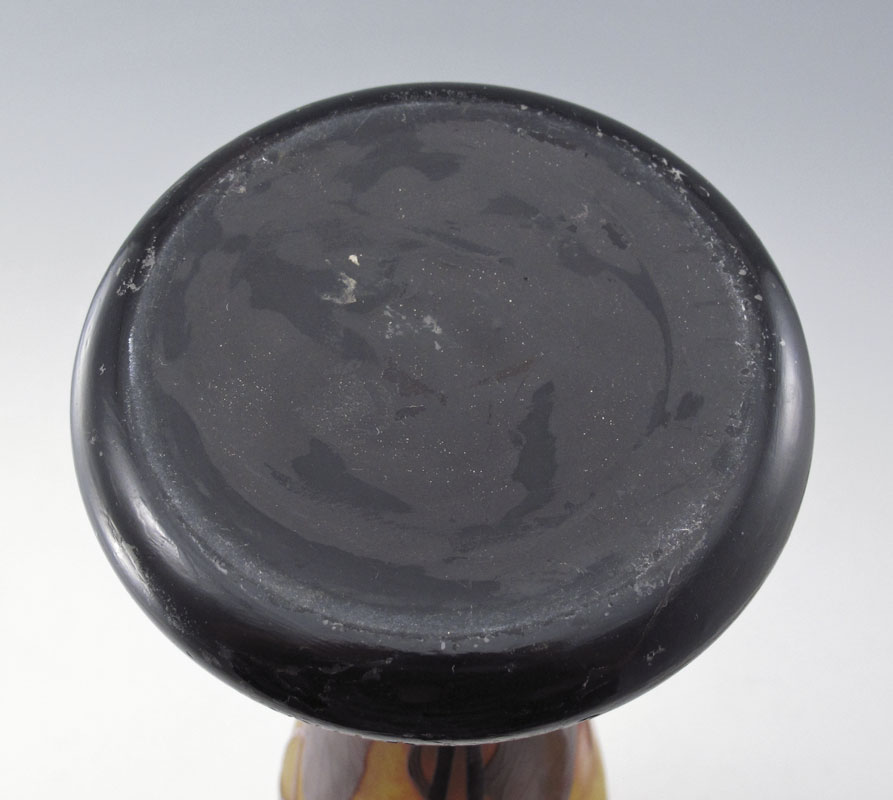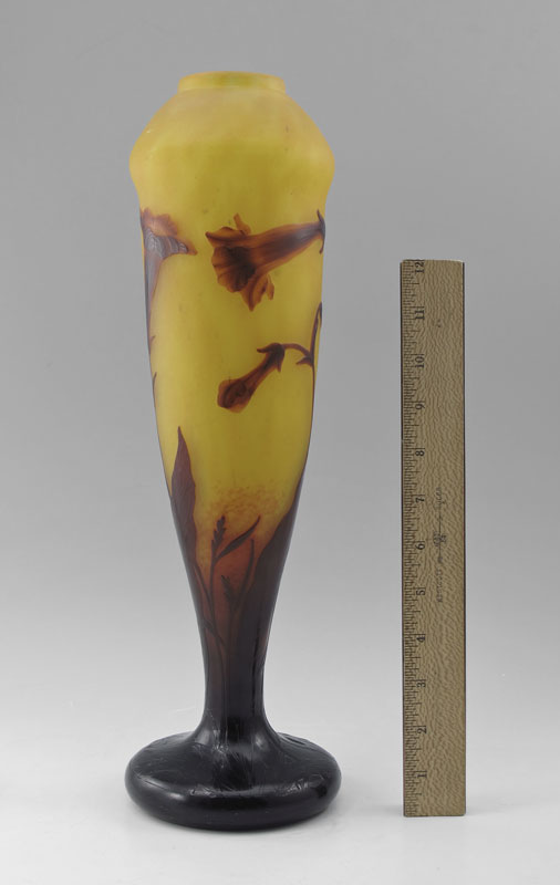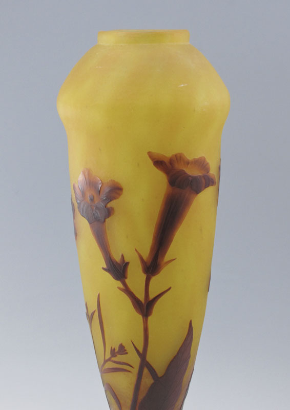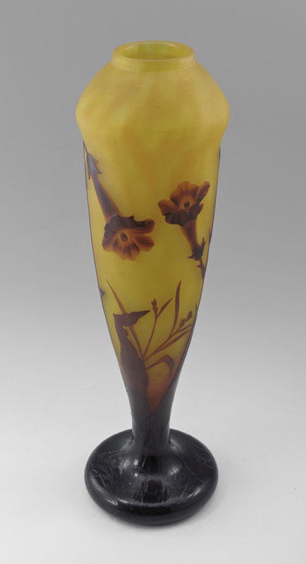 DAUM NANCY FRENCH CAMEO ART GLASS VASE: Early 20th C. Carved leaf and flower design in autumn colors. Signed Daum Nancy with the Cross of Lorraine. 16'' tall.