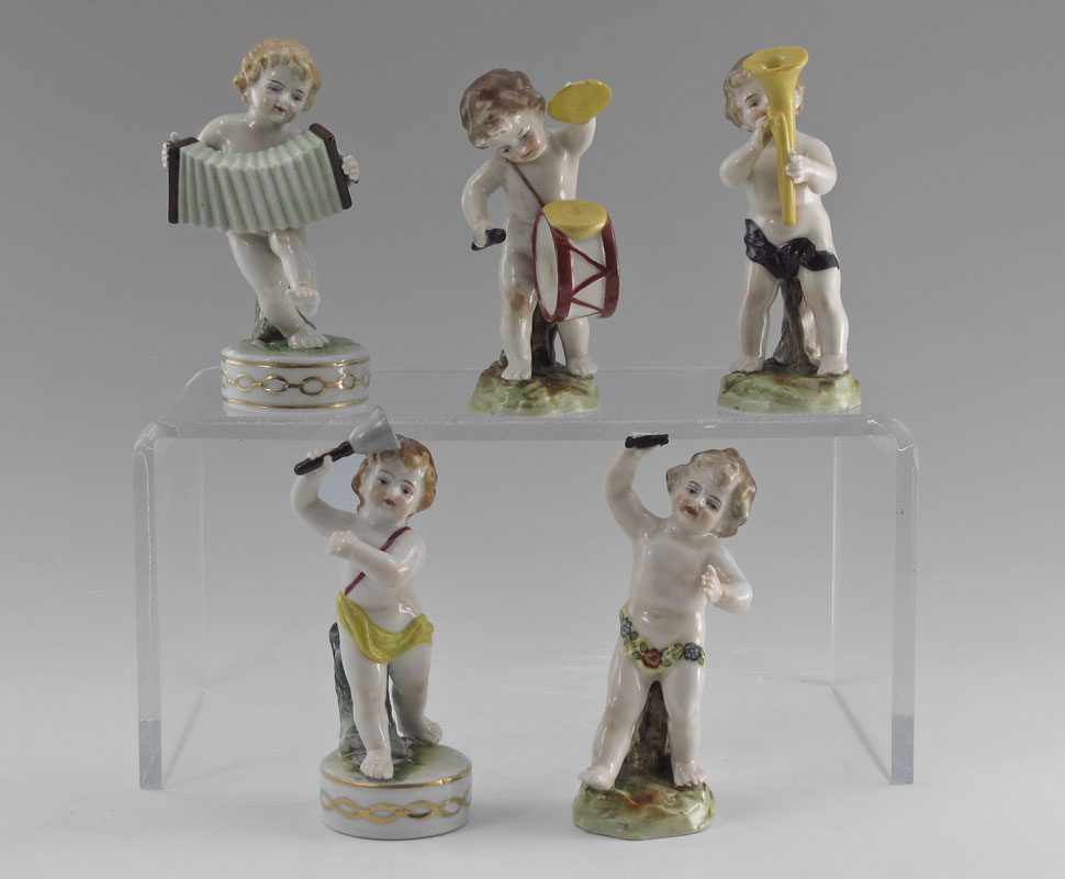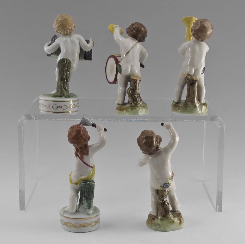 5 PIECE ROYAL VIENNA MUSICIAN FIGURINES: Figural putti musician, 3 being Royal Vienna, 2 are Muller.