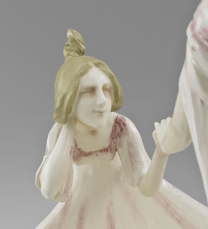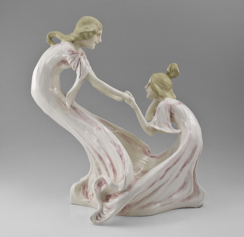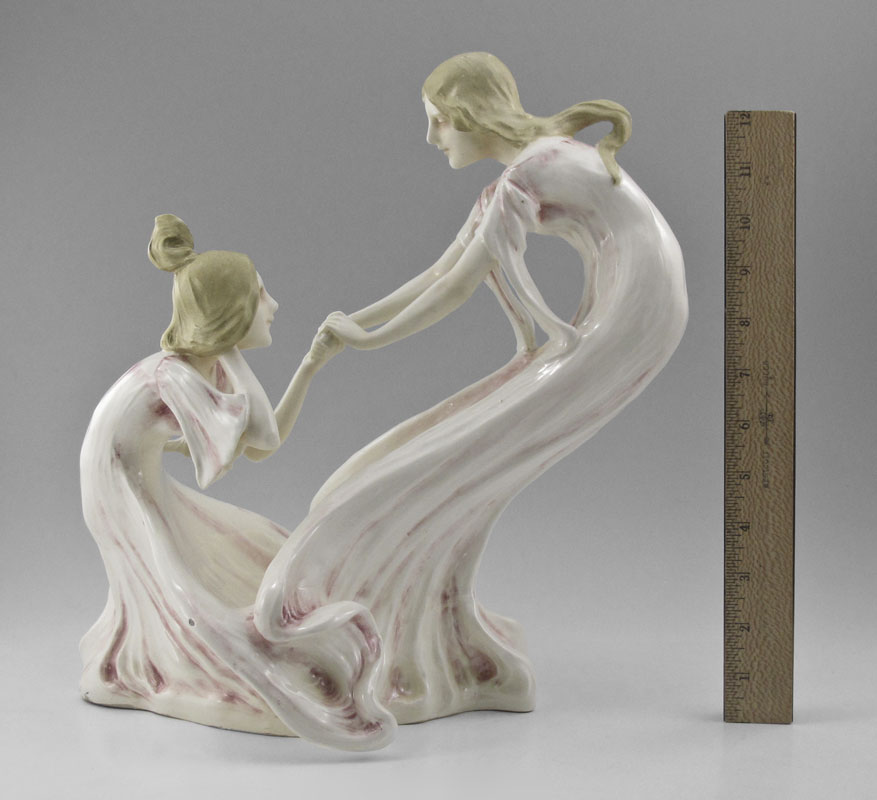 ART NOUVEAU CERAMIC FIGURAL GROUP: Two girls in a playful mood. Illegible impressed mark. Approx. 14'' tall x 14'' wide.