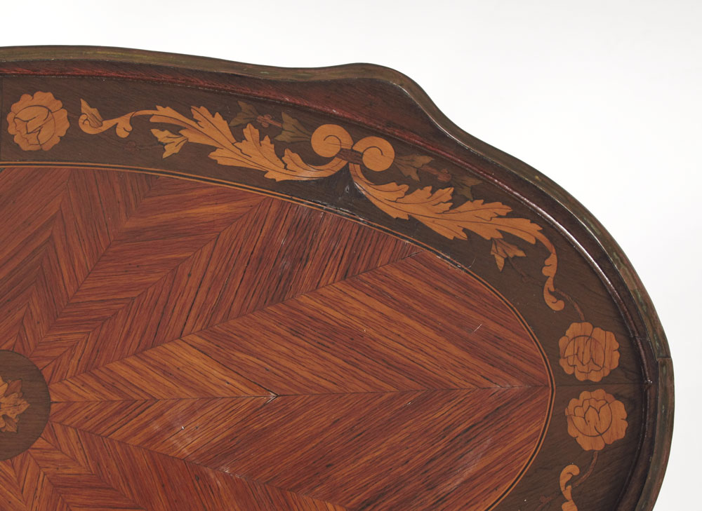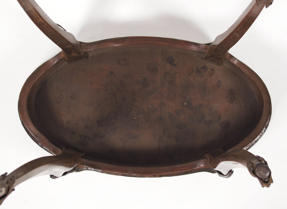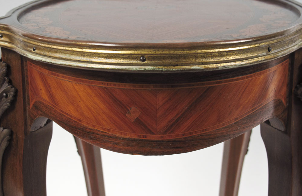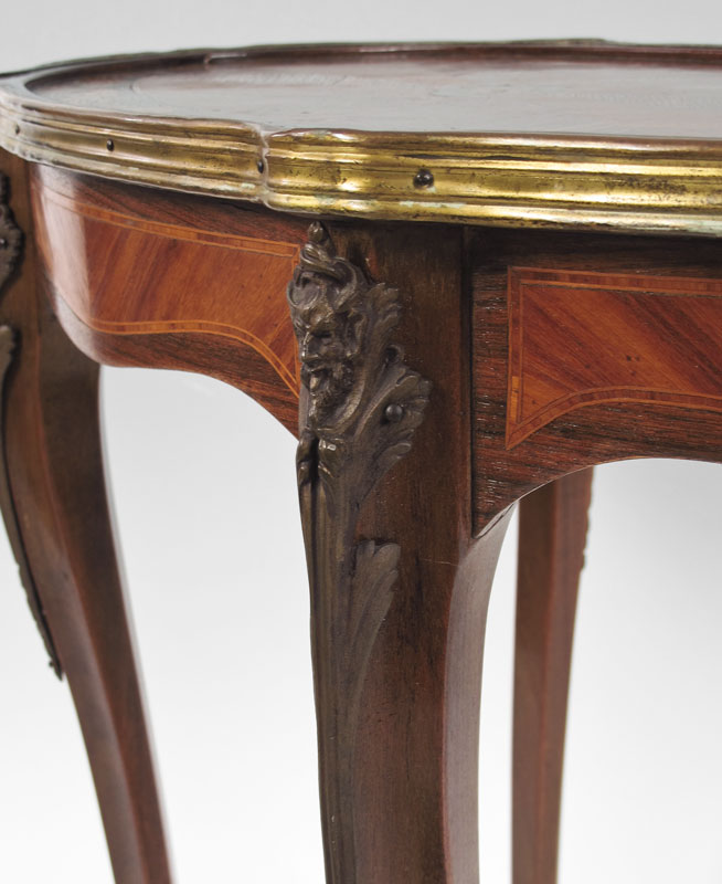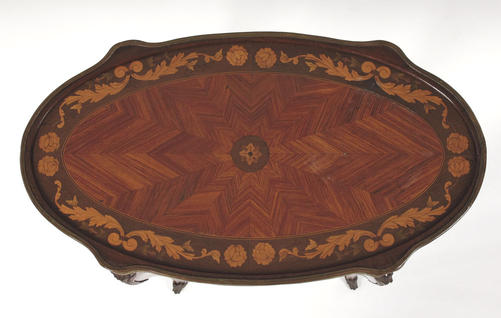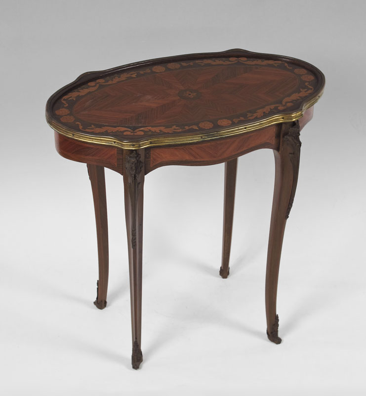 OVAL TOP FRENCH INLAID TABLE: Top inlaid with center medallion and floral swag. Cast metal accents on legs and feet. 25'' h. x 25'' x 14''.