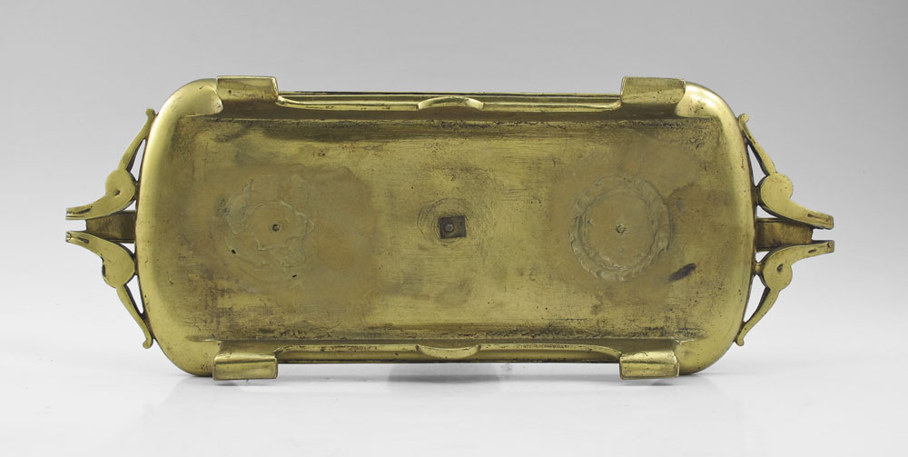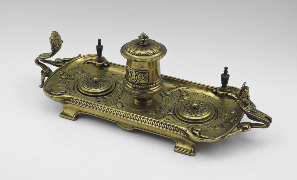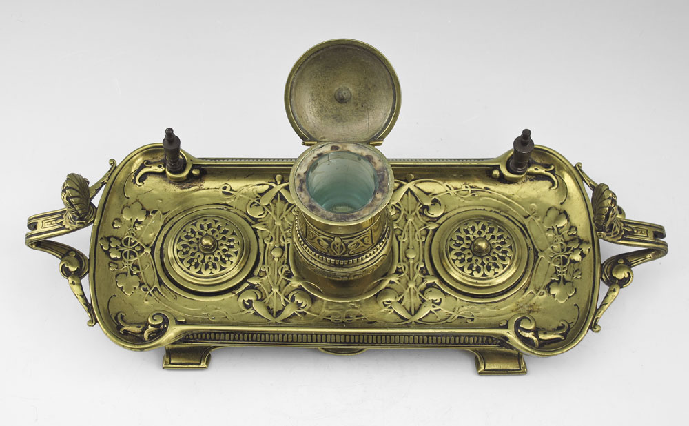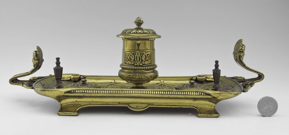 ART NOUVEAU BRASS INKSTAND: Cast brass with single well with glass insert. Unmarked. 4 3/4'' h. x 13 1/4'' x 5''.
