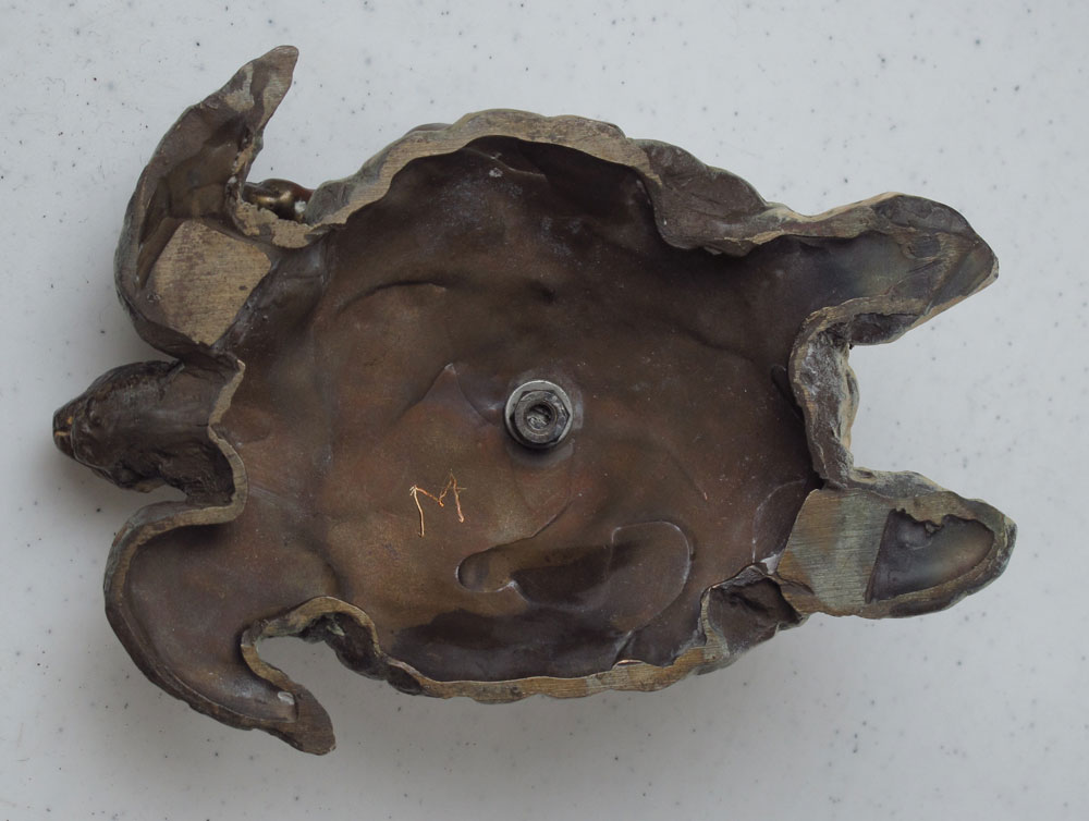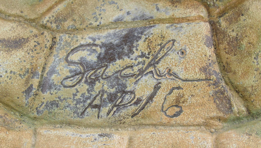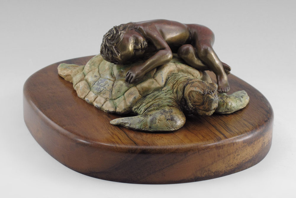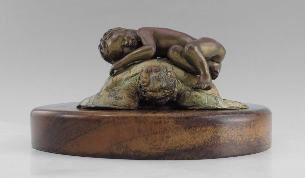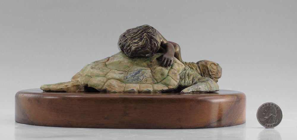 SACHI, Karla, (American, 20th Century): ''Amazing Grace'', bronze sculpture of a boy on the back of a turtle. Affixed to wood base. Sachi is a well known Hawaiian artist and was Playboy's first ''Centerfold Surfer'' in 1966. Signed and numbered AP/6 Overall 4 1/4'' h. x 9 1/2'' x 8''.