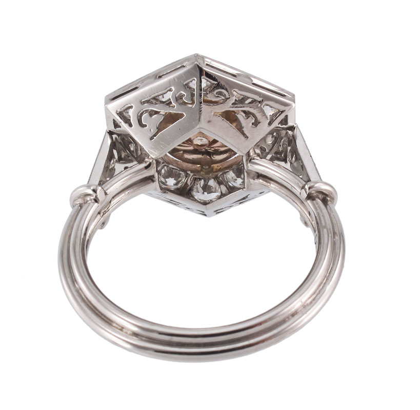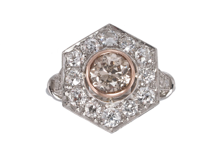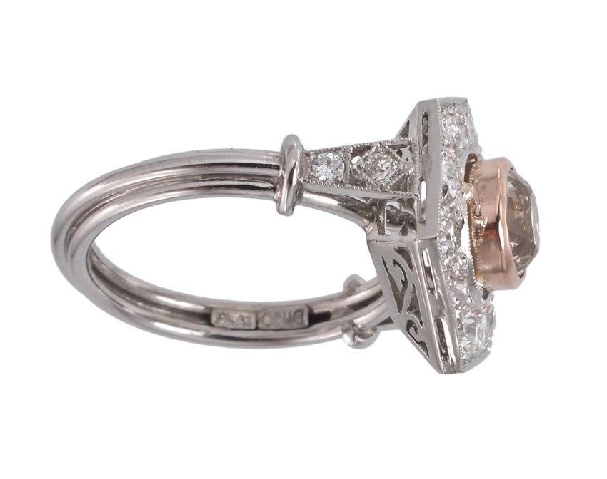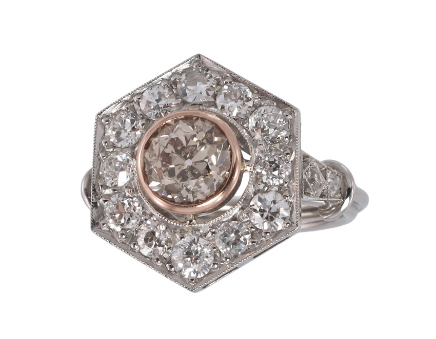 PLATINUM FANCY COLOR OLD EUROPEAN CUT DIAMOND RING: Platinum ring centers one 1.25 Ct. Old European round cut diamond, natural fancy Light Brown with orange tones, rated SI2 in clarity. The hexagon framing the center stone is set with 16 Old European round cut diamonds, totaling 1.4 Ct., VS-SI in clarity and H-I in color. The center diamond is bezel set in rose gold, the smaller diamonds are bead set. Hand crafted by and signed Dino. Size 6.5. Weight 7.3 grams. Sold with current Atlanta Gemological's GIA graduates appraisal for $9,250.
