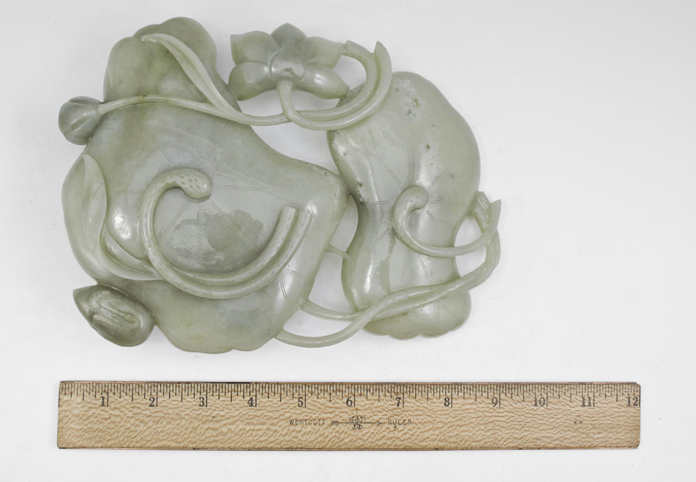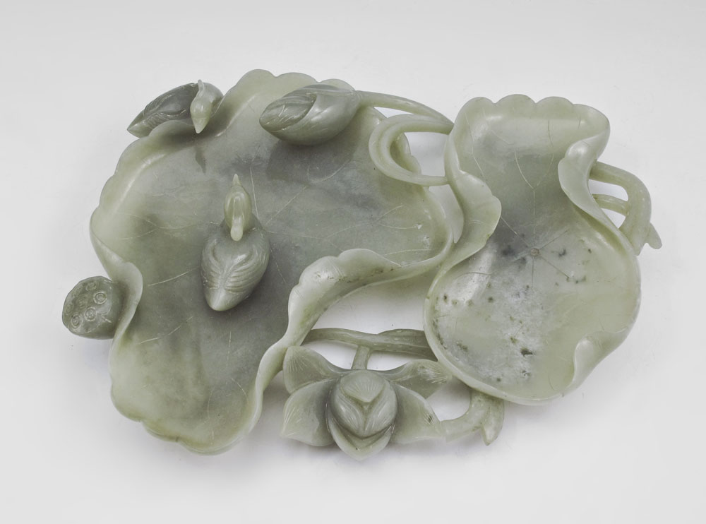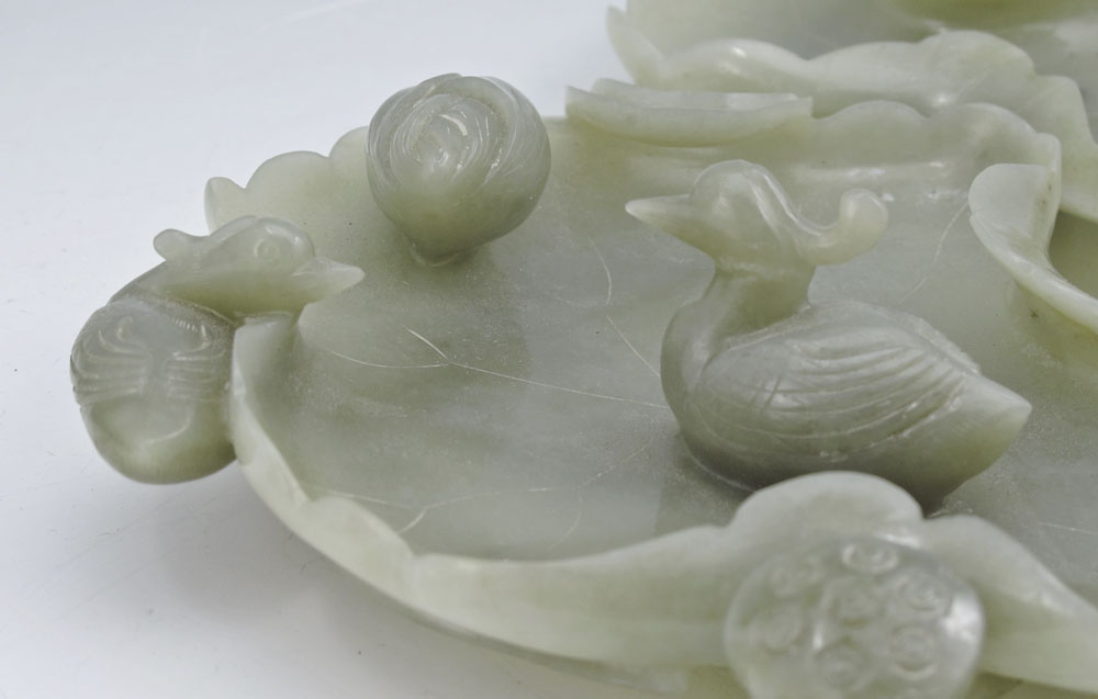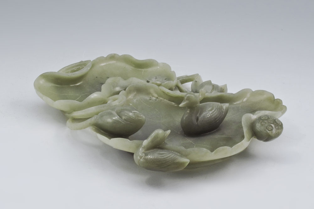 MINIATURE CHINESE CARVED STONE WATER POND: Featuring birds and lilypads. 9'' x 6 3/4''.
