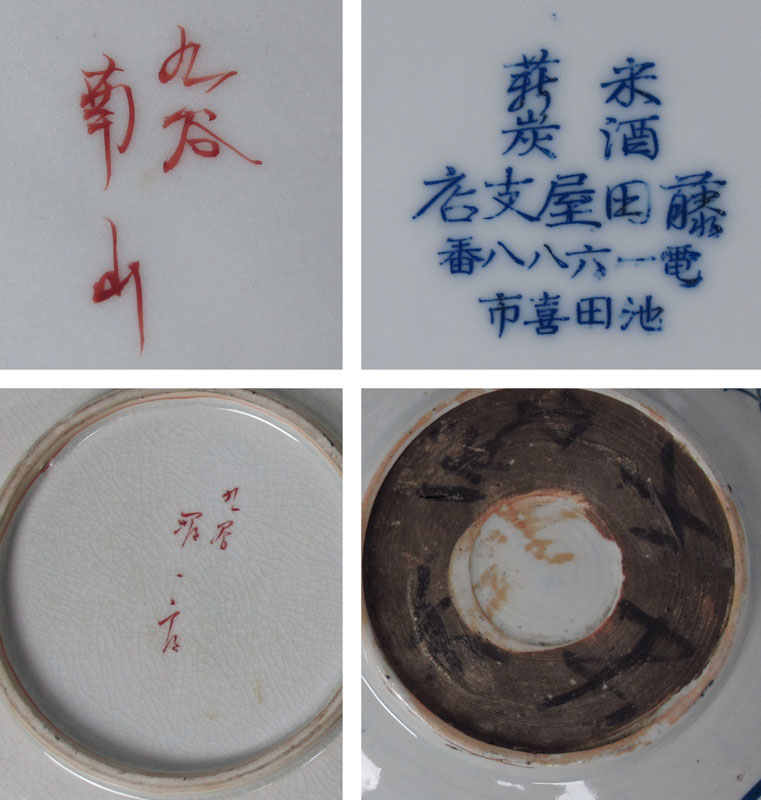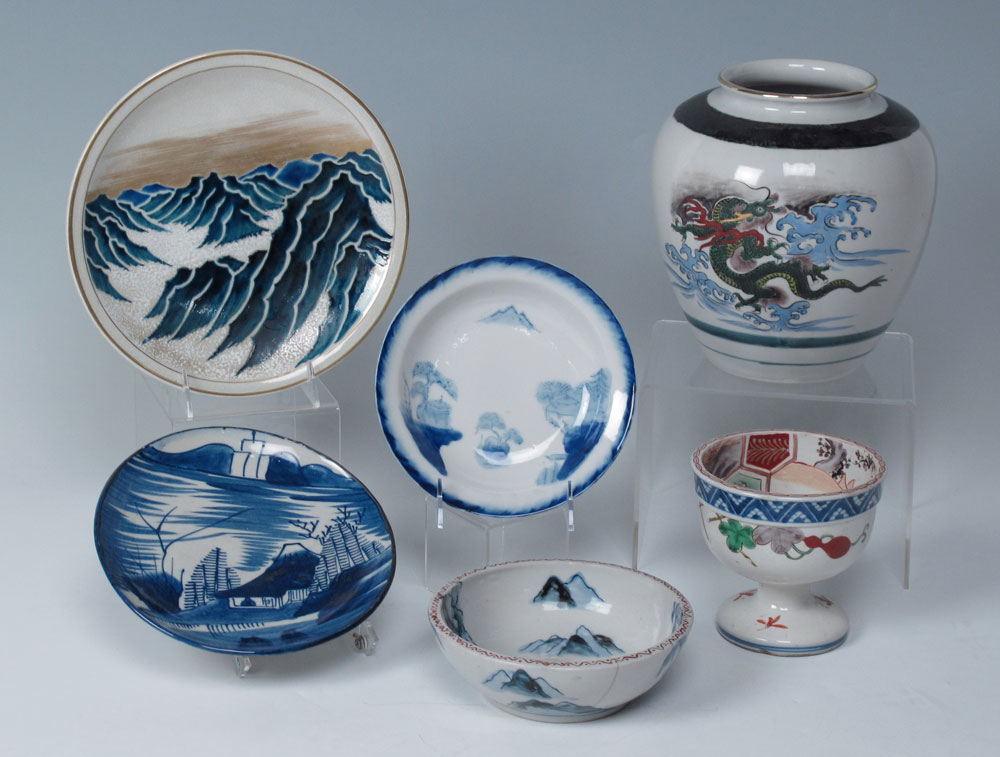 6 PC JAPANESE POTTERY: Imari, Kutani, Arita. To include a signed 9'' dragon decorated vase, 7'' bowl, 10'' charger, wine cup basin.