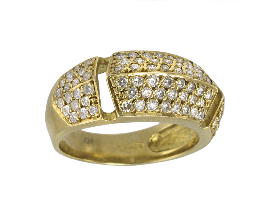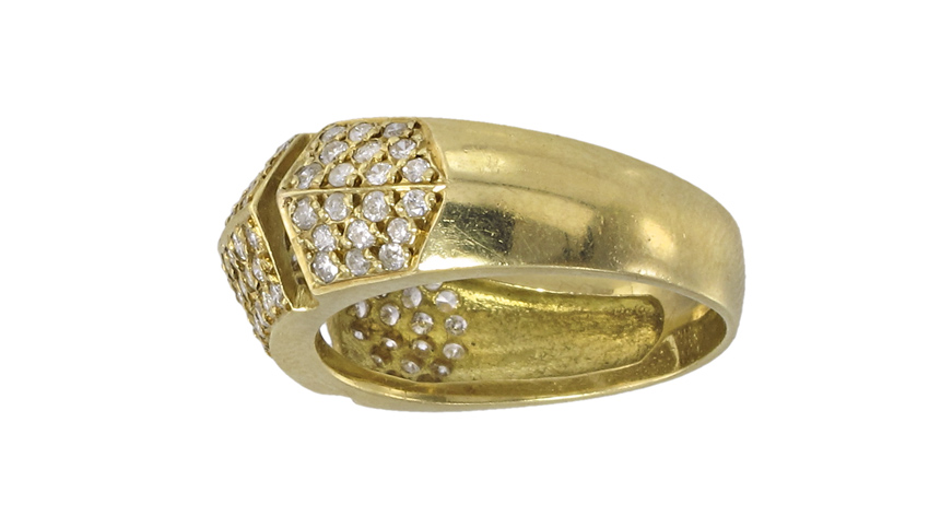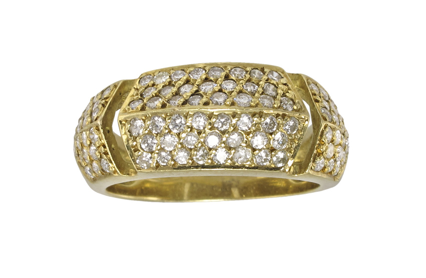 18KT PAVE DIAMOND YELLOW GOLD RING: 18K yellow gold ring contains 86 round brilliant cut diamonds. Weight: 1.00 Ct. Approx. The diamonds average VS-SI in clarity and H-I in color. The diamonds are pave set. Weight: 5.9 grams Size: 7