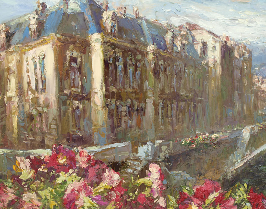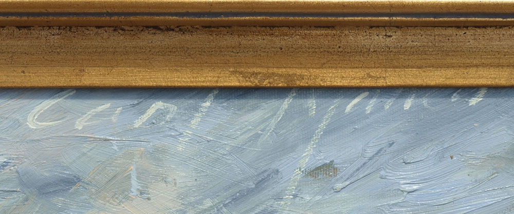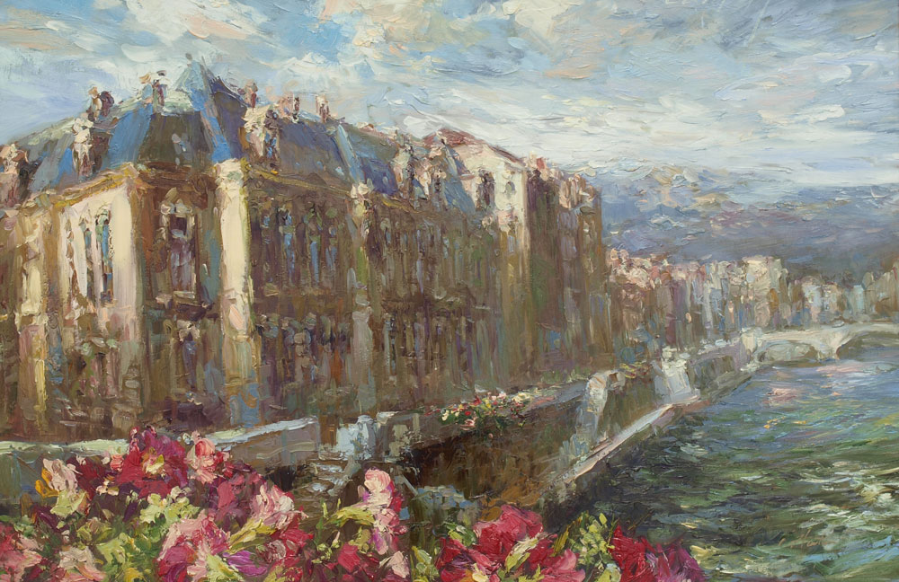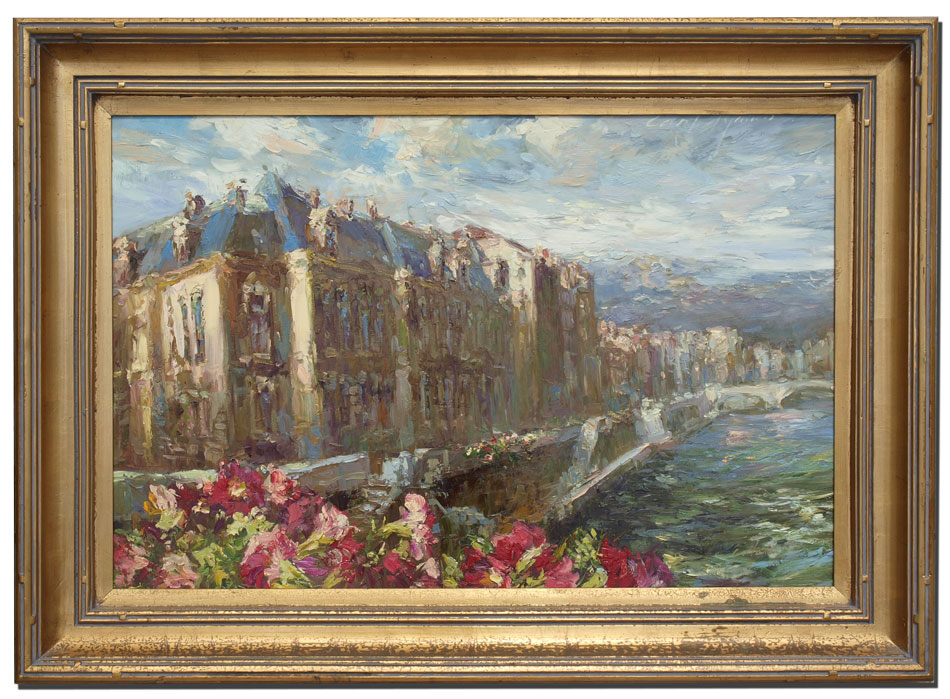 CONTEMPORARY OIL/CANVAS VIEW OF PARIS FROM THE SEINE: Oil/Canvas, 24'' x 36'', illegibly signed upper and lower right, gilded frame, 33'' x 45''.