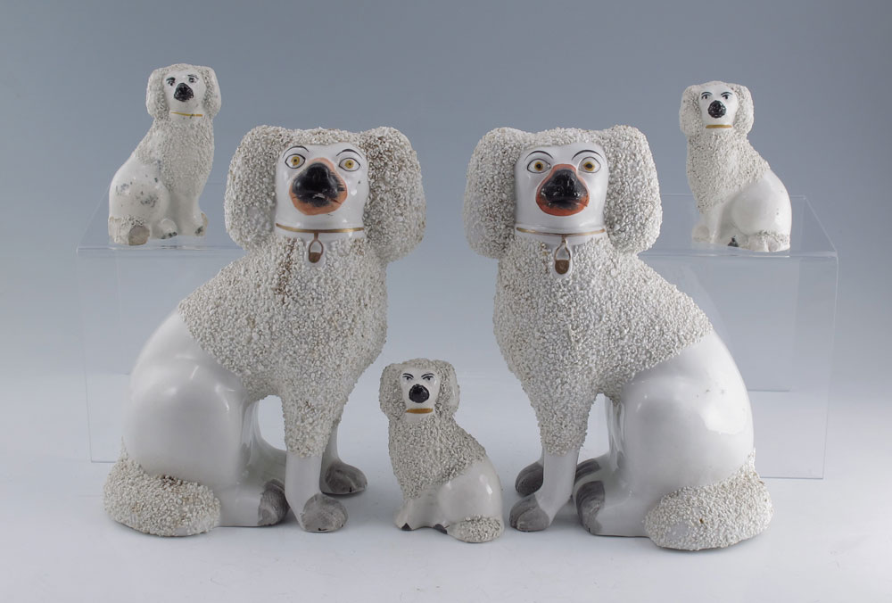 COLLECTION OF 5 STAFFORDSHIRE DOGS: To include pair of larger dogs, unmarked, 8'' h. x 7''. 3 smaller dogs approx. 3 3/4'' h.