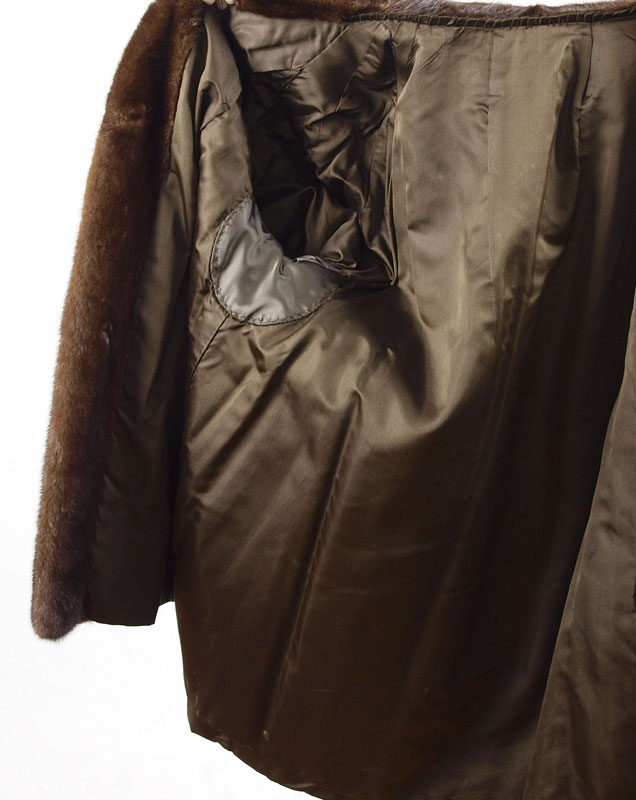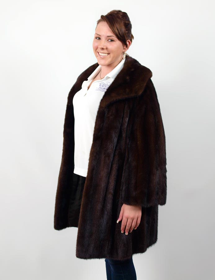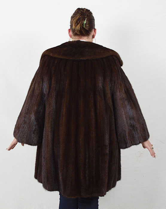 DARK CHOCOLATE BROWN MINK FUR COAT / JACKET: A larger size coat with generous collar and bell sleeves, interior pocket. Approx. 35'' length.