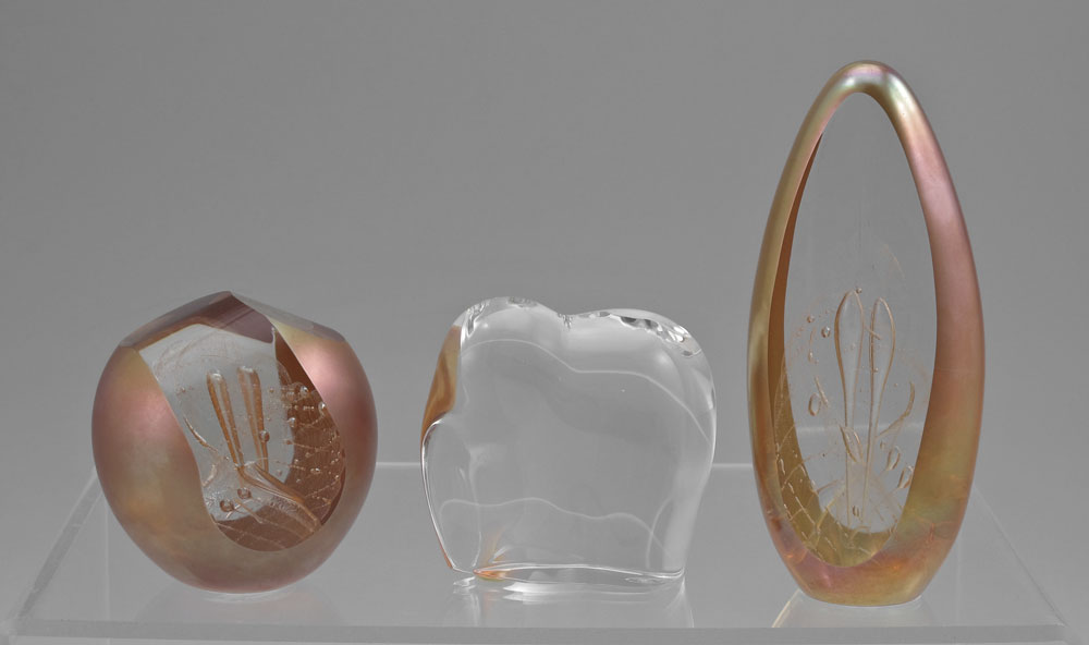 3 ART GLASS PAPERWEIGHTS: 2 Brian Maytum American art glass paperweights, signed, numbered and dated 1984, approx. 5 1/4'' tall and 2 1/2'' dia. Sold together with a Baccarat French crystal elephant, 3''h.