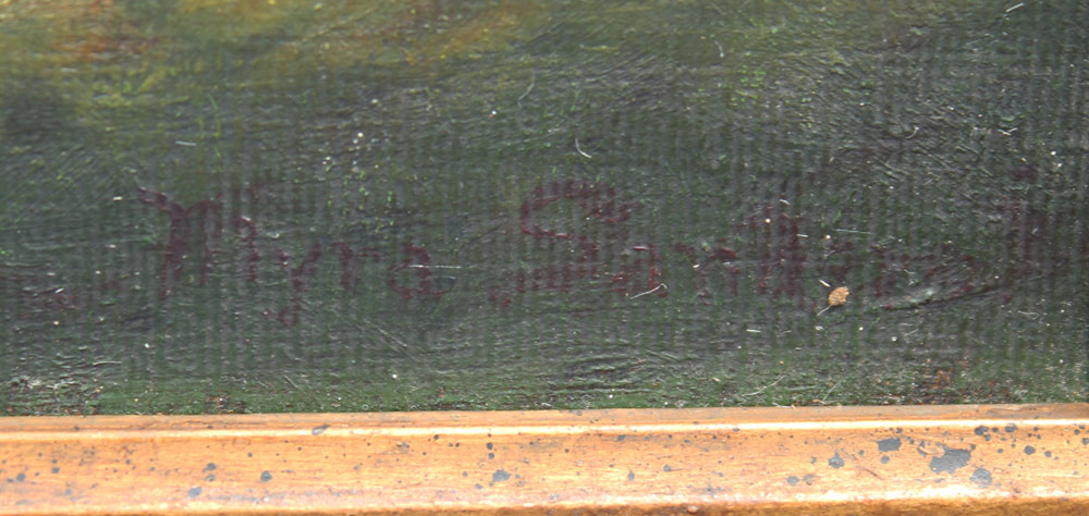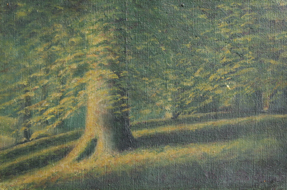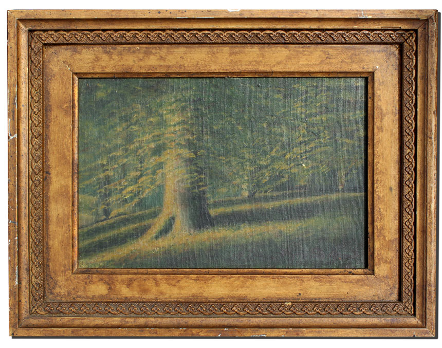 SANDERS, Myra, (American, 20th C.): Kentucky Birch Forest, Oil/Canvas Mounted on Board, 6 1/4'' x 9 1/4'', wooden frame with wear, 9 1/2'' x 12 1/2''.