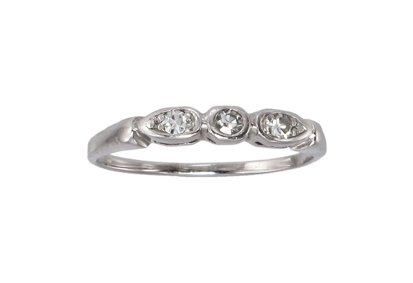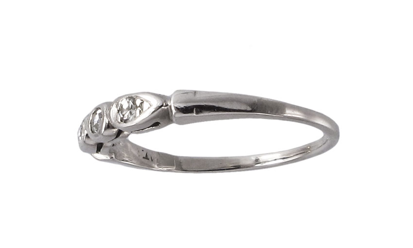 14K DIAMOND BAND RING: 14K white gold band contains three round single cut diamonds. Weight: .15 Ct. Approx. Rated VS in clarity and G-H in color. The diamonds are bead set. Weight: 2.2 grams. Size: 6.