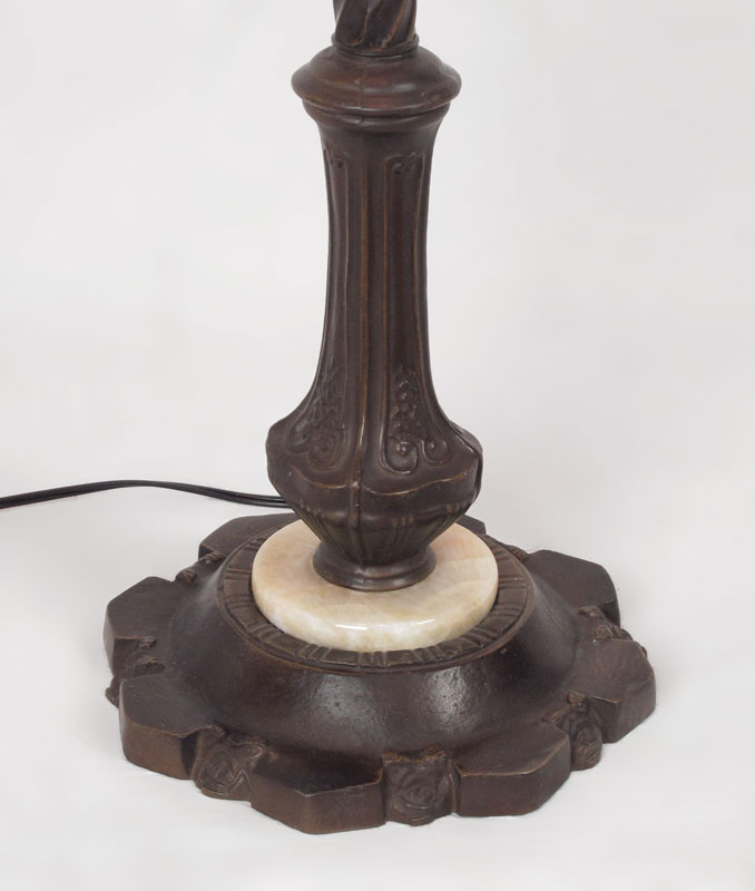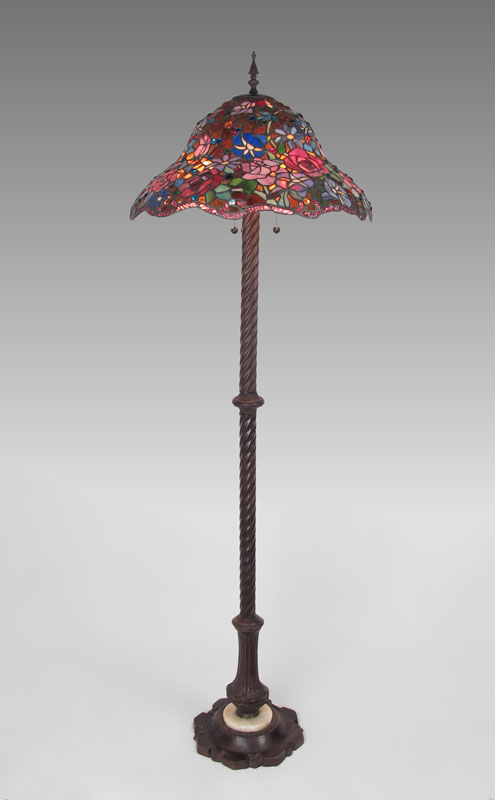 CONTEMPORARY STAINED GLASS FLOOR LAMP: Twist metal and onyx base and stand 64 1/2'' h. x 11''. Floral design shade 10 1/2'' h. x 22'' dia.