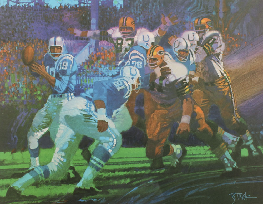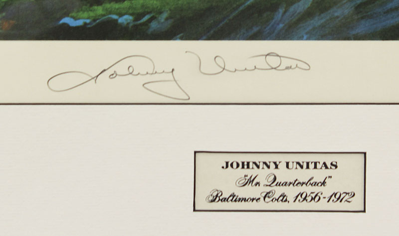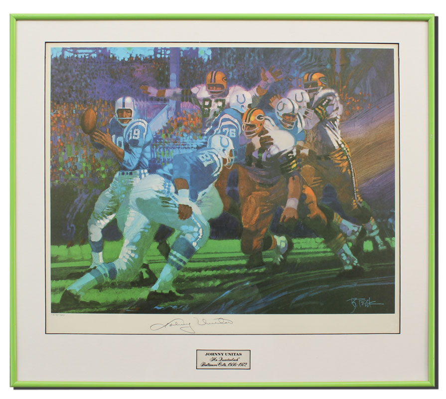 JOHNNY UNITAS LIVING LEGENDS SPORTS ILLUSTRATED LITHOGRAPH: Sight size 16 1/4'' x 20 1/2'', pencil signed by Johnny Unitas and numbered 1018/1500, painted green frame, 21 1/2'' x 24 3/4''.
