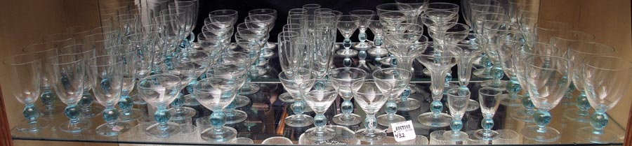 BRYCE HAND BLOWN ''CONTOUR'' STEMWARE: 45 pieces with the Cerulean blue ball stem to include 8 water goblets (5 3/4''), 12 goblets (5 7/8''), 8 sherbert (4 1/2''), 5 champagne flutes (6''), 4 liquor cocktail (4''), 5 hollow stem (5 7/8''), and 2 liqueur stems.