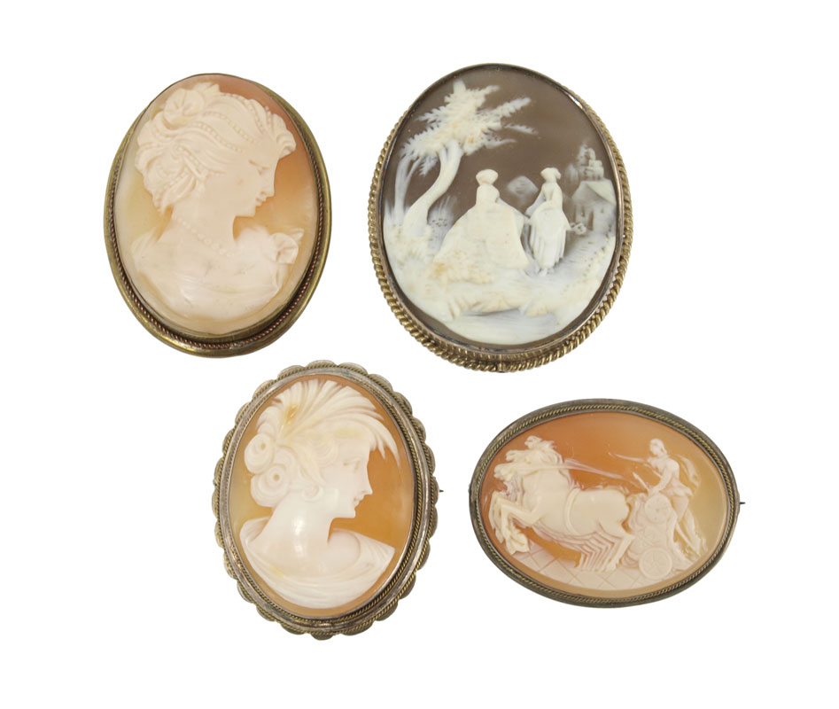 LOT OF 4 CARVED SHELL CAMEOS: 1) Female profile with feather in her hair, set in 800 silver, brooch and pendant findings, 1 3/8'' x 1 1/8'', with original Italian presentation box, 1 7/8'' x 1 9/16''. 2) Chariot, driver and three horses, set in 800 silver, brooch finding, 1'' x 1 5/16''. 3) Scene of two women and a building in landscape, backed by glass for memorial display, missing findings, metal content unknown, 1 5/8'' x 1 3/8''. 4) Delicate female profile set in brooch and pendant frame, metal content unknown 1 1/2'' x 1 1/4''. Sold as a lot.