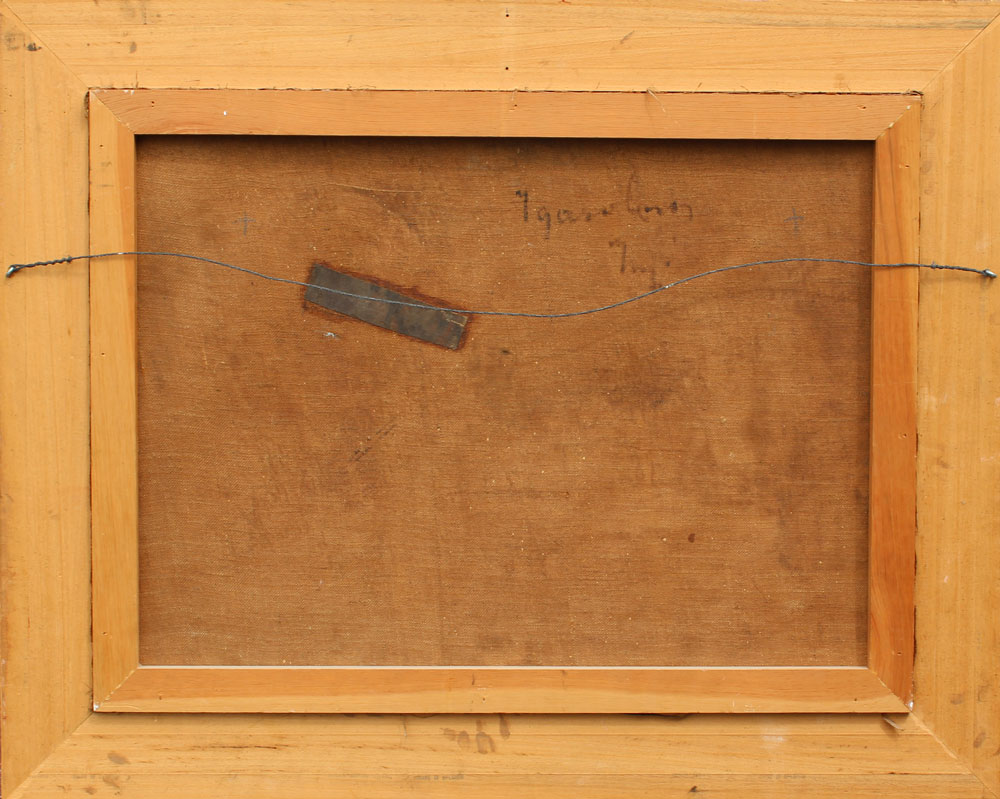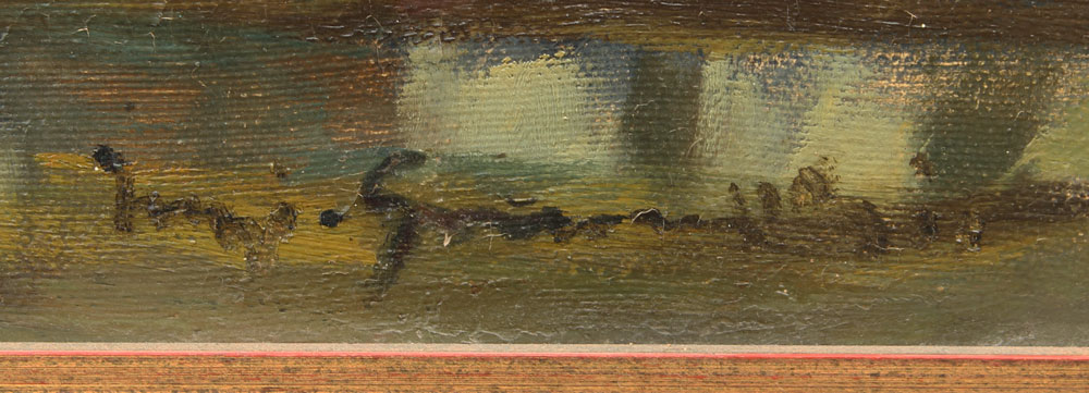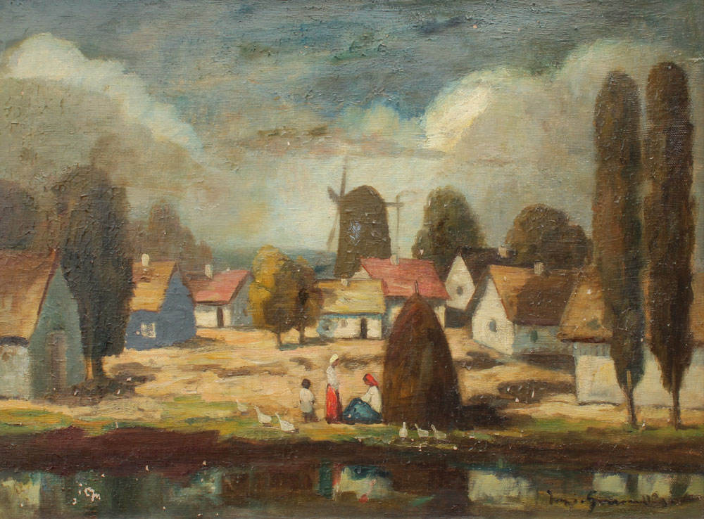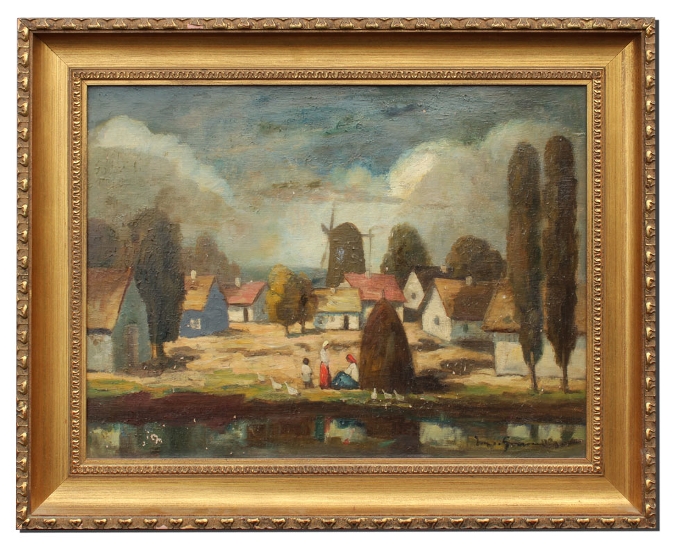 ILLEGIBLY SIGNED EUROPEAN VILLAGE SCENE WITH FIGURES: Oil/Canvas, 23 1/2'' x 31 1/2'', signed lower right, also signed verso illegibly, gilded frame, 31'' x 39''.