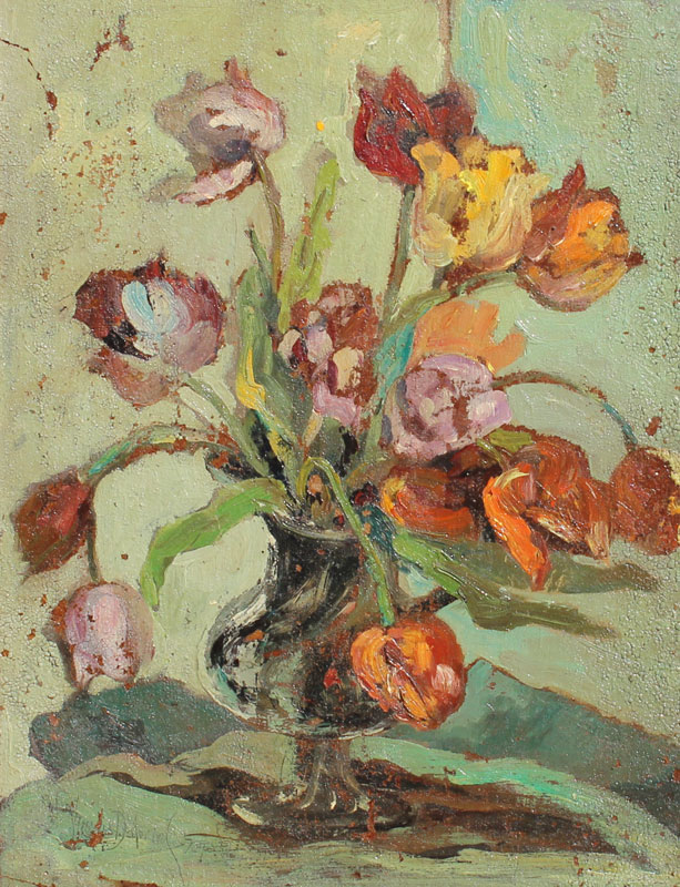 ILLEGIBLY SIGNED IMPRESSIONIST FLORAL STILL LIFE PAINTING: Oil/Masonite, 23 1/4'' x 17 3/4'', illegibly signed lower left, carved wood frame, 31'' x 25''.