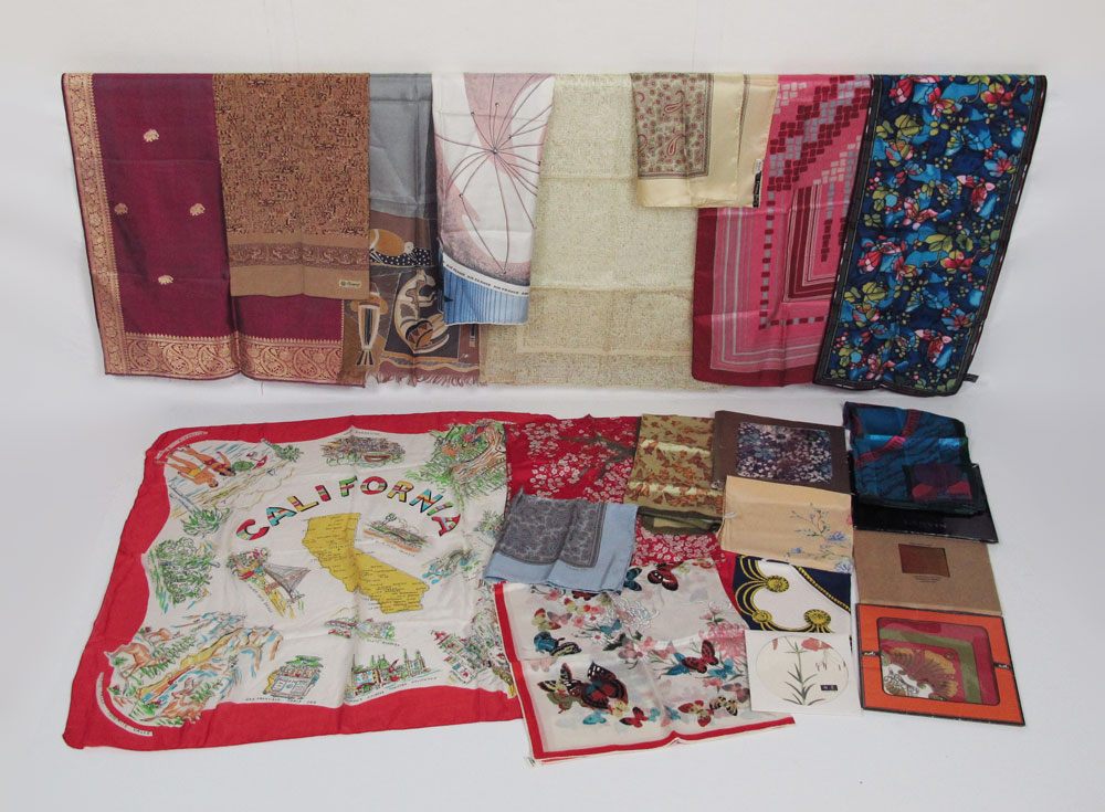20 PC COLLECTION OF SCARVES INCL. HERMES: The Hermes and Valentino have never been removed from the box. Other highlights are Vera, one from the US Tennis Association, Air France, Lanvin, MMA stained glass window, Japanese silk, Christian Dior, California scarf, Reine Seide, etc.