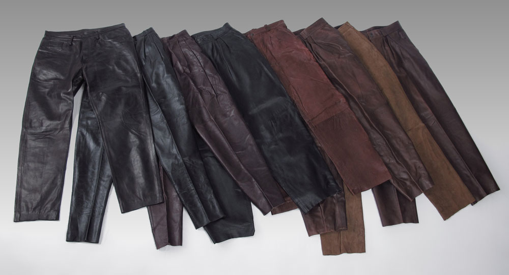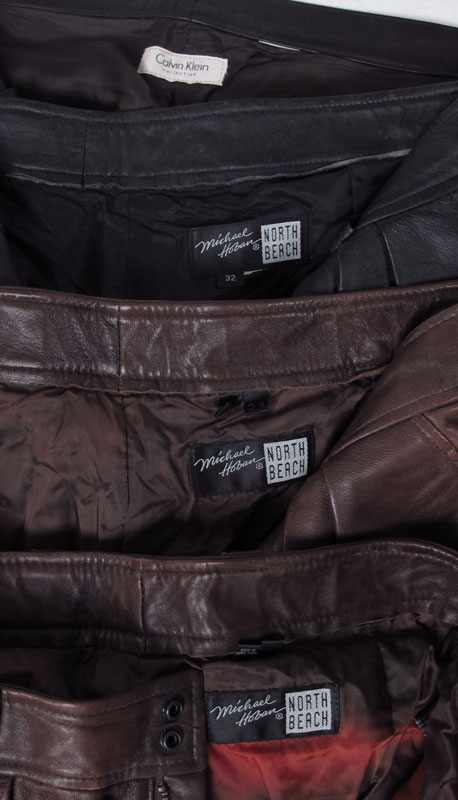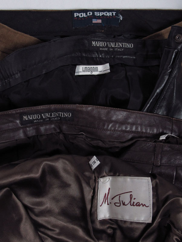 8 PAIRS OF LEATHER SLACKS / PANTS: Calvin Klein (32'' waist), Michael Hoban North Beach (32 & 34''), suede Polo Sport (31''w. no hem), 2 Mario Valentino (24''w., no hem), and M. Julian (30''w.). The leather is soft and supple.