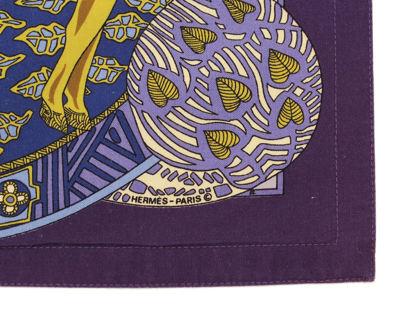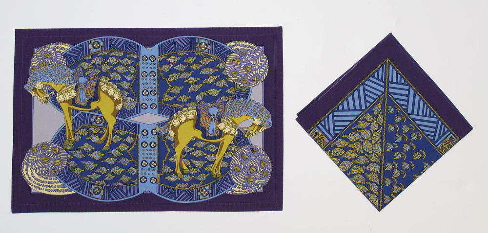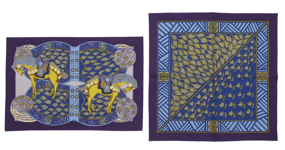 SET OF 6 HERMES PARIS PLACEMATS: Rich gold and purple horse and graphic design. Made in France of 100 percent cotton. 18 3/4'' x 12 1/2''. Hermes cloth labels on each. Sold with 6 matching napkins, printed Hermes.