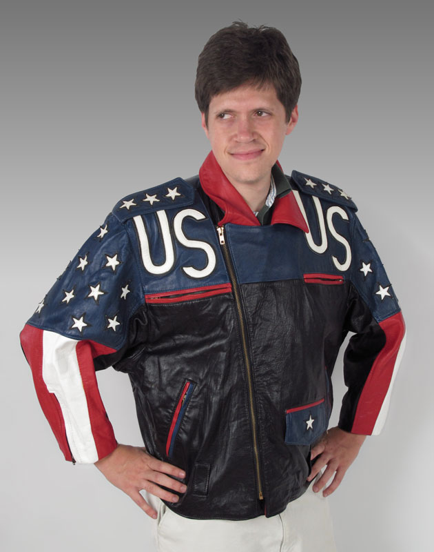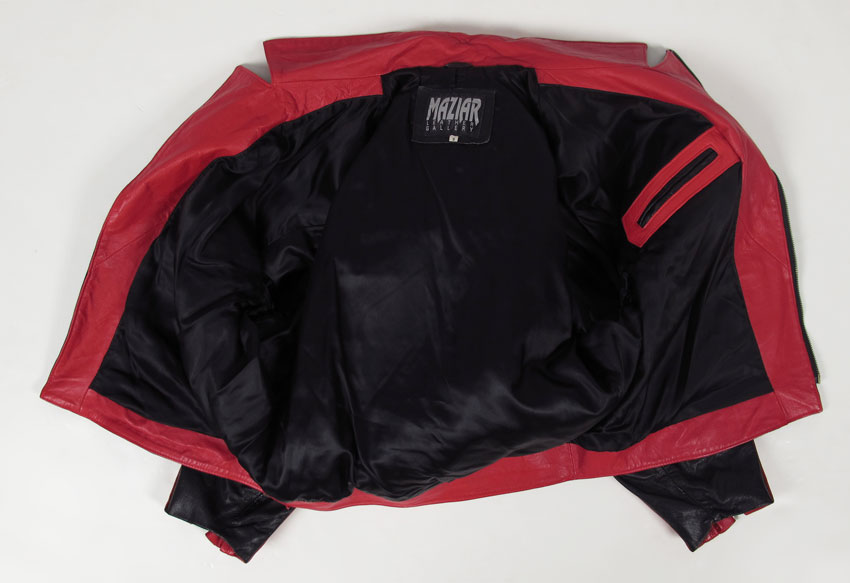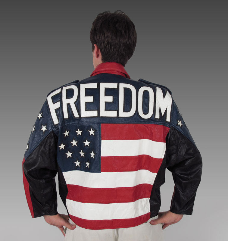 MAZIAR PATRIOTIC FREEDOM LEATHER JACKET: Bold red, white and blue leather jacket. Wide open lapel or zip up to just below the neck.