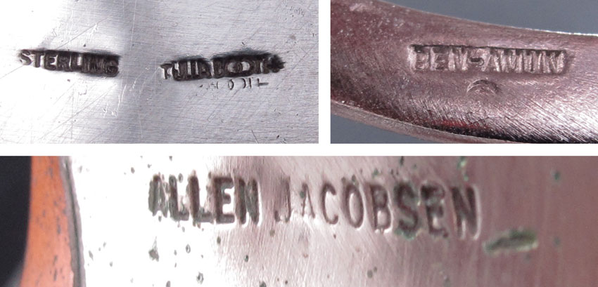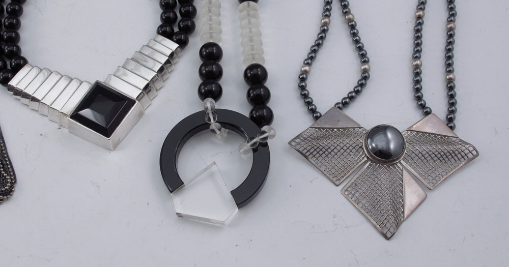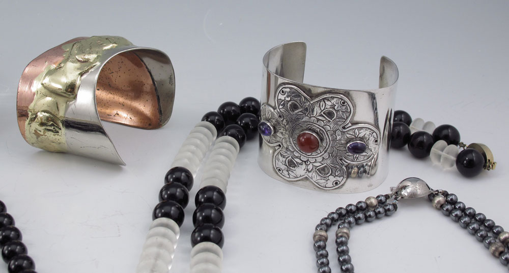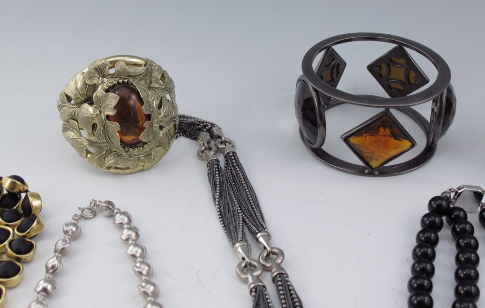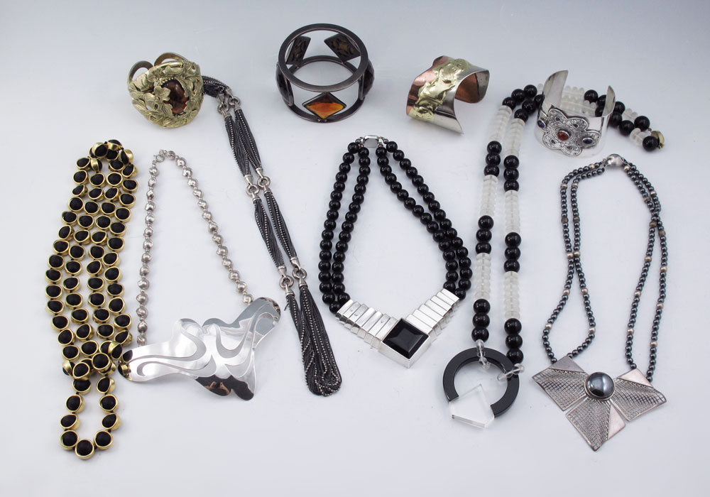 LOT OF CONTEMPORARY FASHION JEWELRY: To include, ALLEN JACOBSEN hand sculpted mixed metal cuff; TULLA BOOTH Sterling cuff set with amethyst and carnelian; BEN-AMUN wide bangle; BG'S sterling necklace. Plus a few other cool and funky pieces just marked Sterling, one marked Italian Sterling. And two very interesting necklaces - Black and clear glass? beads marked S.S and an unmarked articulated Bead in Band necklace. Sold as a lot.