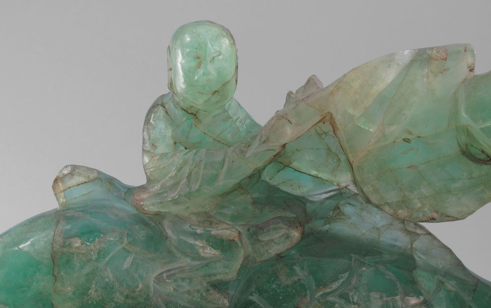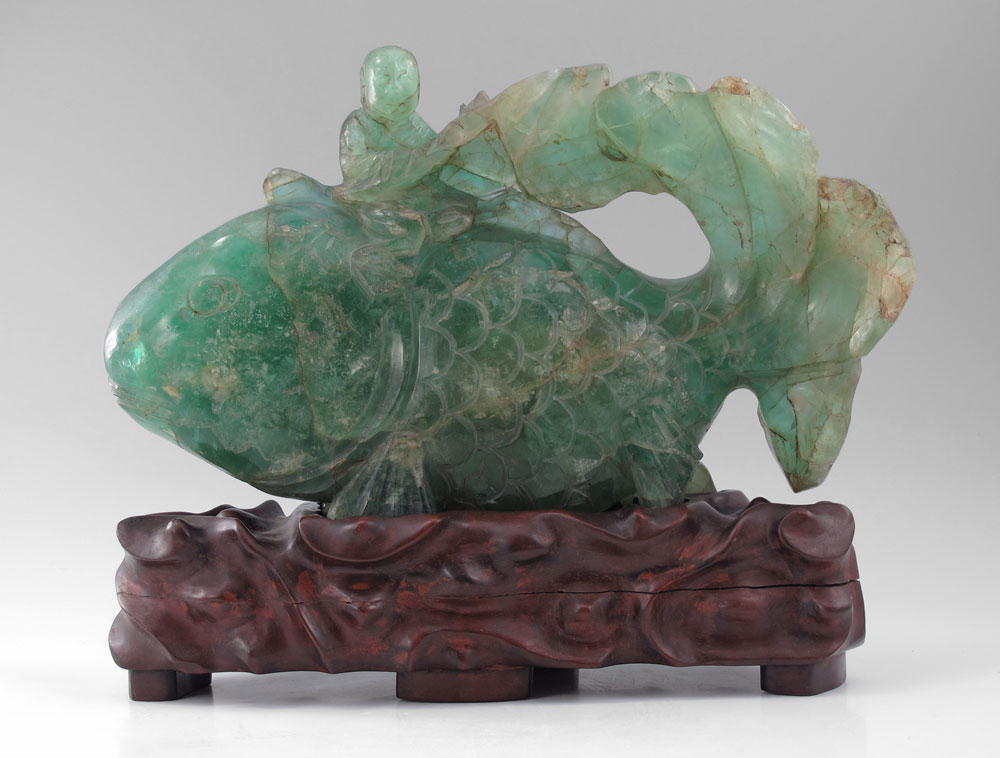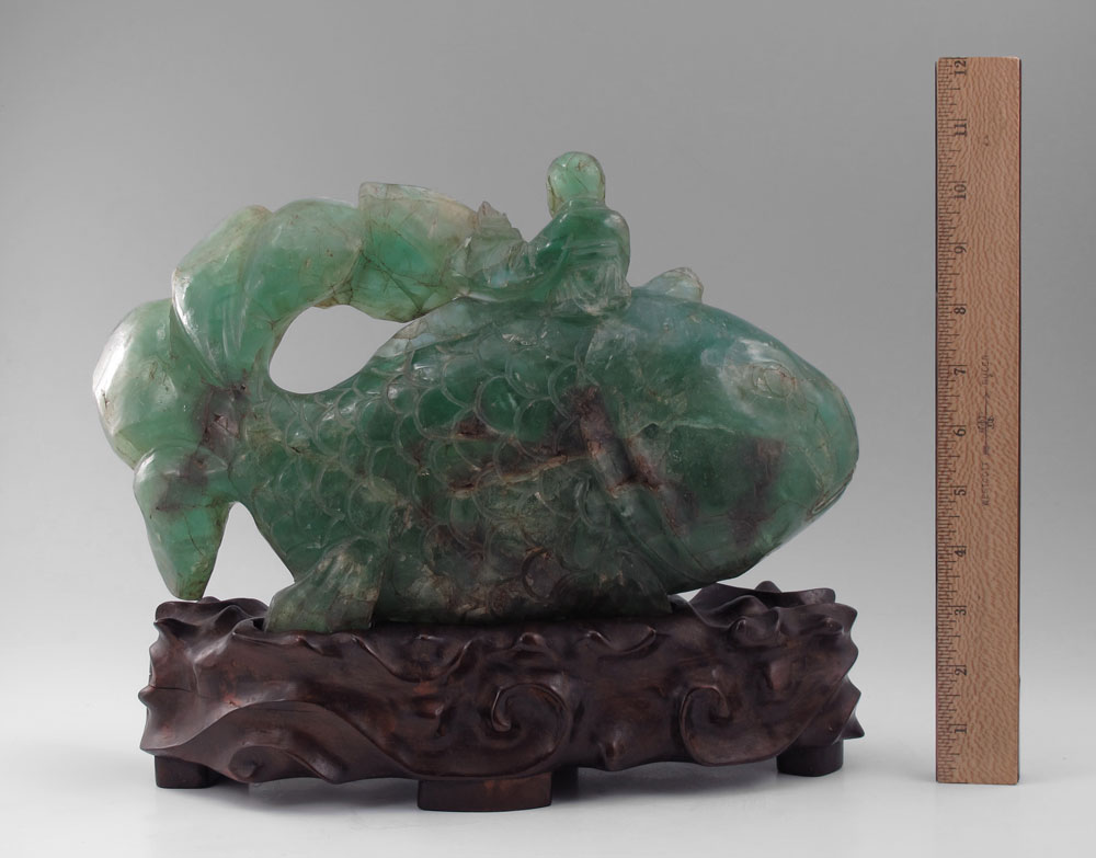 CHINESE CARVED GREEN QUARTZ CHILD RIDING A SEA BREAM: Approx. 11'' tall x 12'' overall, including the custom stand.