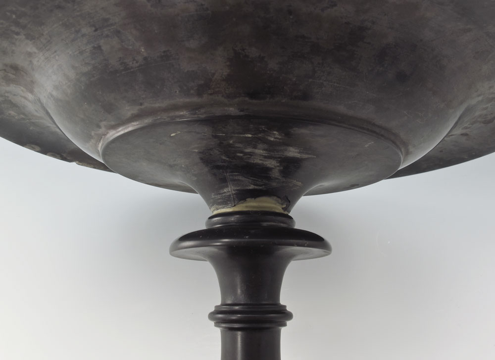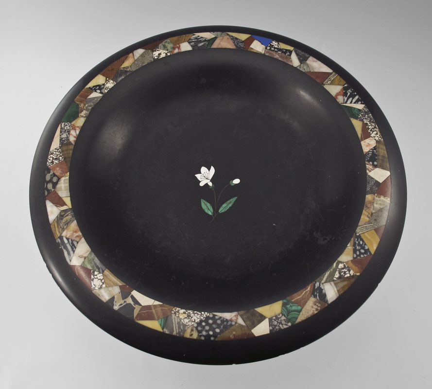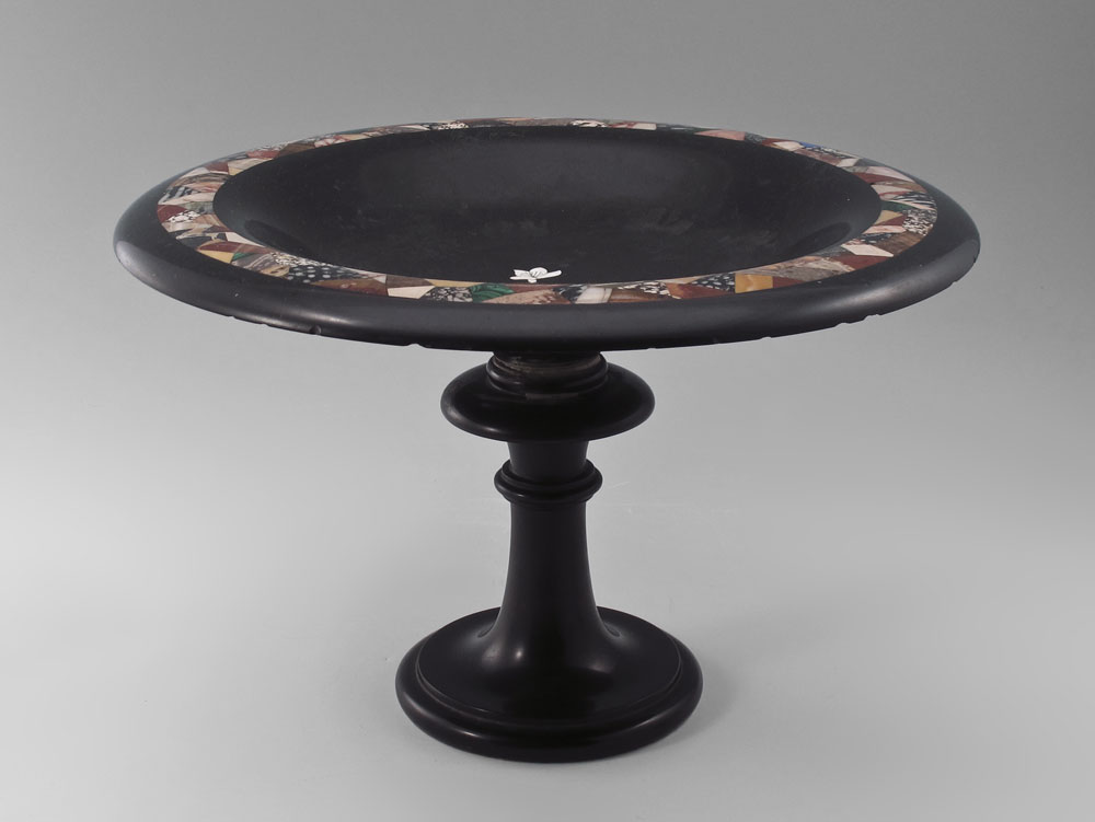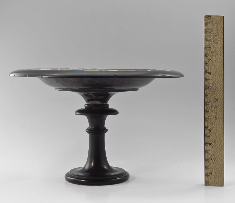 BLACK BASALT MARBLE TAZZA: Pedestal bowl with the rim inlaid with multi colored marble mosaic band. Approx. 8 1/2'' h., 13'' dia.