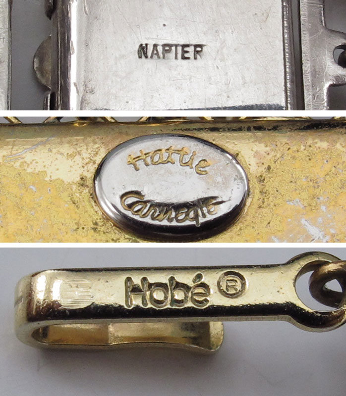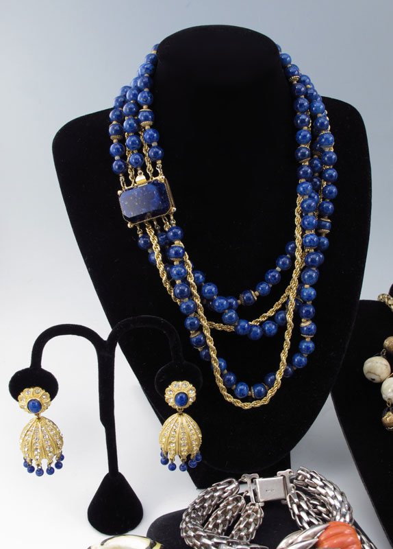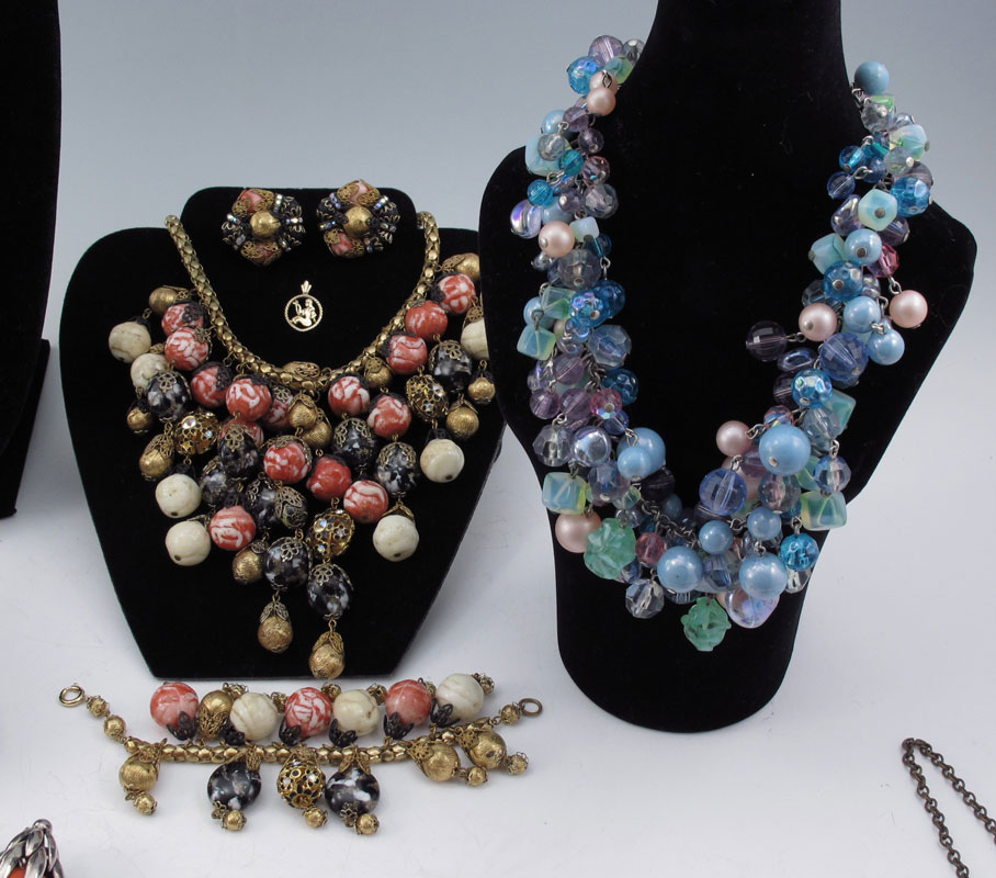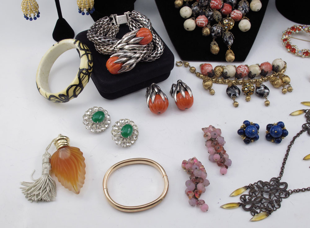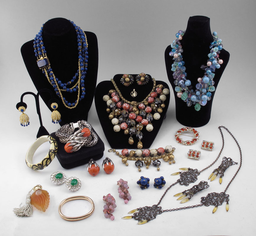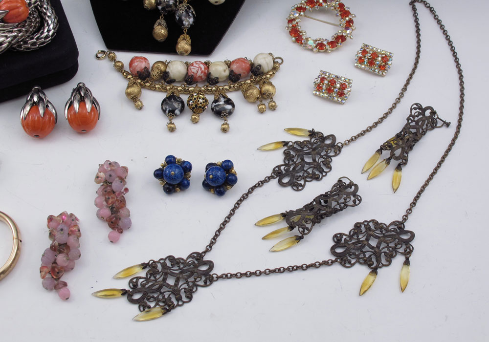 LOT OF VINTAGE ESTATE COSTUME JEWELRY: To include, HOBE' ensemble of necklace, bracelet and clip earrings; HATTIE CARNIGIE ''Lapis'' bead necklace and clip earrings; KRAMER bright orange circle pin and matching clip earrings; VENDOME' ''jade'' and rhinestone clip earrings, abstractly decorated bangle; NAPIER mesh and ''pumpkin'' bead bracelet and matching clip earrings; K.J.L. dangle earrings; ALICE CAVINESS cluster clip earrings; unmarked pastel cluster bead necklace; unmarked filigree and butterscotch rhinestone necklace and matching earrings; gold filled bangle and tiny 14k gold charm; even a little glass bottle full of perfume. Sold as a lot.