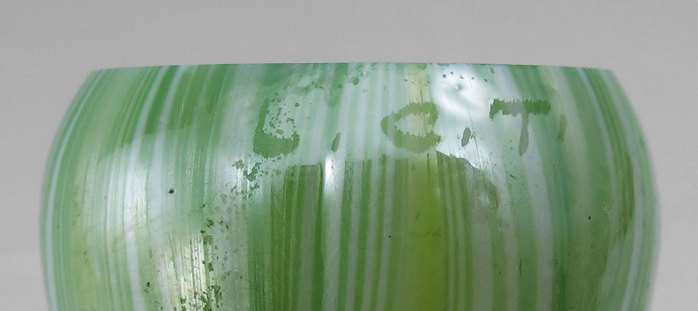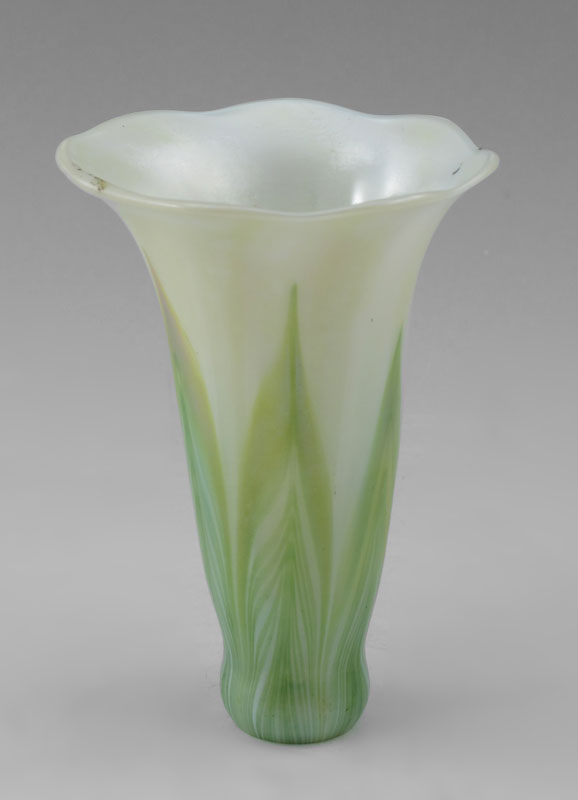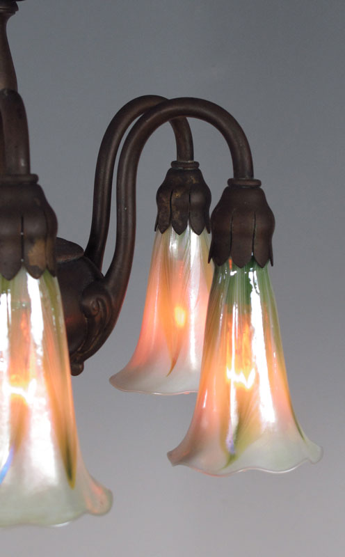 TIFFANY ERA HANGING LAMP WITH IRIDESCENT ART GLASS SHADES: Shades signed LCT. 12'' h. excluding chain x 12 3/4'' dia.