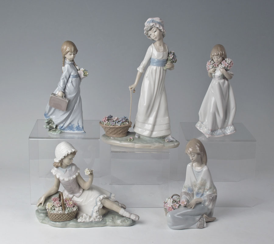5 LLADRO PORCELAIN FIGURINES: SCHOOL DAYS, #7604, Antonio Ramos designer, glazed, Society Piece 1988, 8 1/4''h.; WILD FLOWER, #5030, Vincente Martinez designer, glazed, issued 1979 retired 1994, 11''; SPRING BOUQUETS, #7603, Juan Huerta designer, glazed, Society Piece 1987, 8 3/4''h.; FLORINDA, #4907, Vincente Martinez designer, issued 1974 retired 1985, 6 1/2''h.; FLOWER SONG, #7607, Juan Huerta designer, glazed, Society Piece 1988, retired 1989, 7 1/2''.