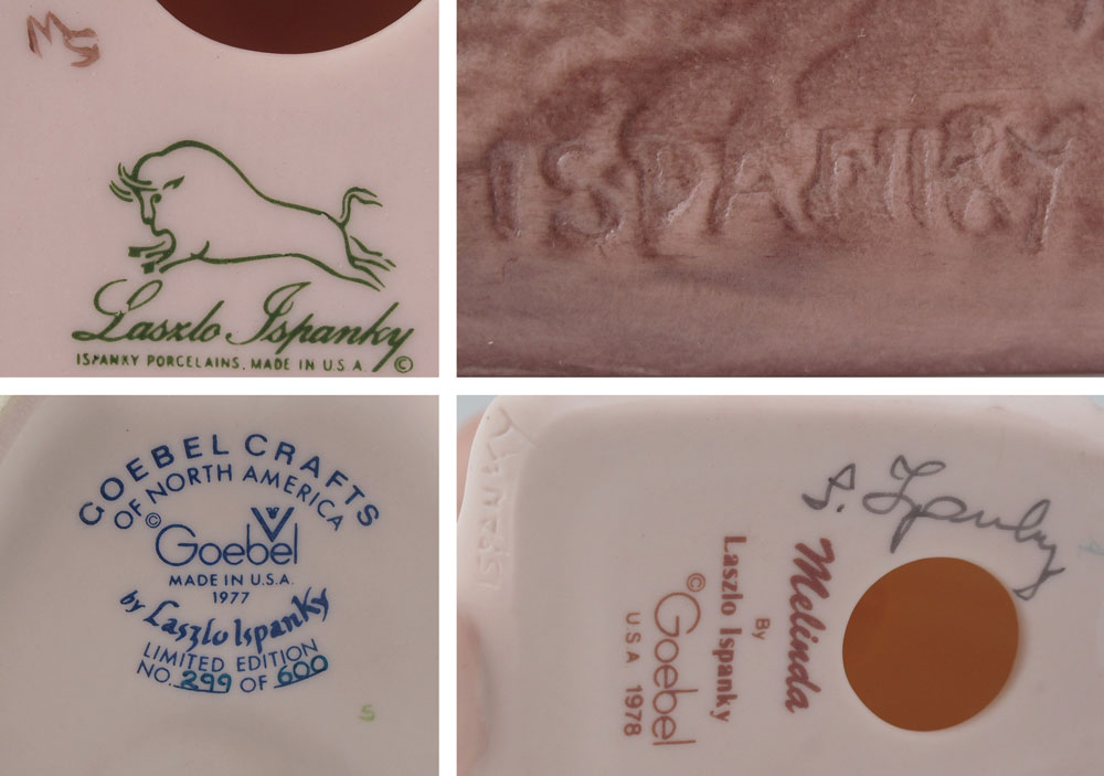 ESTATE LOT OF SIX LASZLO ISPANKY FIGURINES: To include, for Ispanky Porcelains USA an semi nude maiden with swaddled infant, 10''h.; for Goebel USA ''MELINDA'', signed, dated 1978, 6 1/4''; for Goebel Crafts of North America Woman dancing with ribbon and flowers, Limited Edition 299 of 600, dated 1977, 12 1/4'' x 8 1/2'' x 6 /12''; Woman seated at a piano, Limited Edition 100 of 800, additional round sticker from Cobb's Collection St. Petersburg Florida, 8 1/2'' x 6 1/4'' x 5 1/2''; Girl with a Gift, 8'' and Seated Boy, 7'' x 5 3/4''. Sold as a lot.