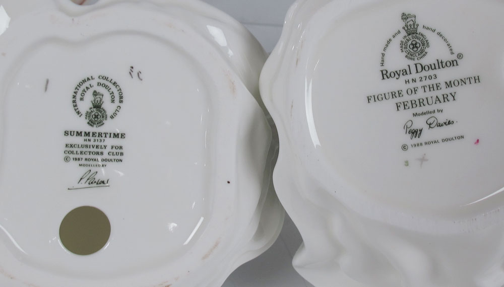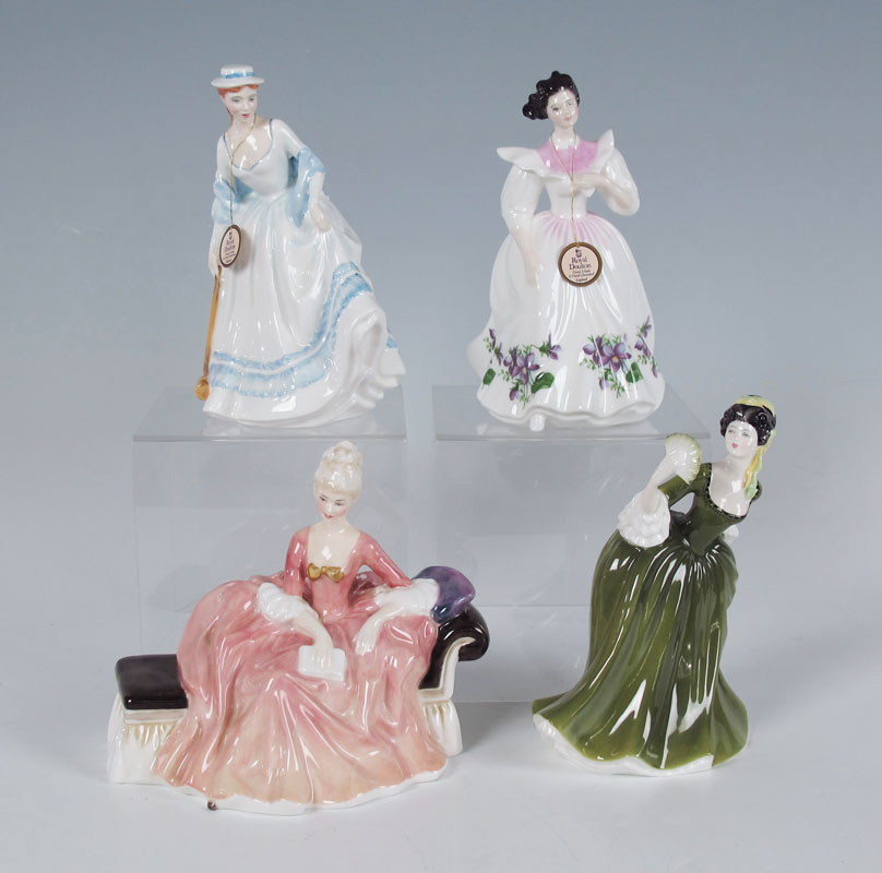 4 ROYAL DOULTON FIGURINES: FIGURE OF THE MONTH - FEBRUARY, HN 2703; SUMMERTIME, HN 3137; REVERIE, HN 2306; SIMONE, HN 2378, 7 1/2''h.