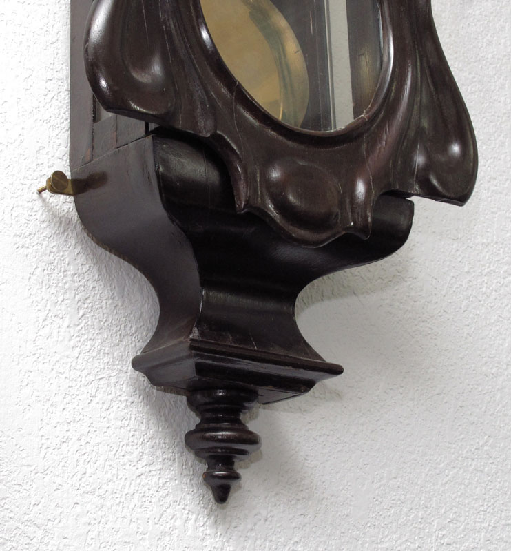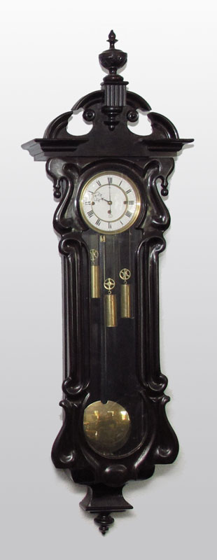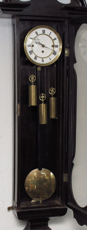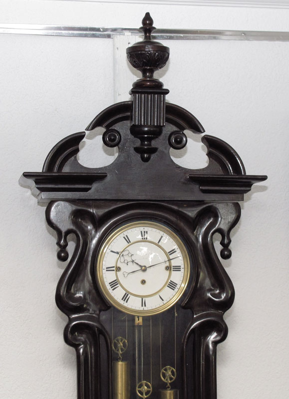 SERPENTINE TRIPLE WEIGHT VIENNA REGULATOR WALL CLOCK: Architectural carved pediment with urn finial over serpentine form case. Illegible dealers name on face. Porcelain dial with Roman numerals, triple weight movement. 60'' h. x 18 1/2'' x 6 1/2''. Crank in office.