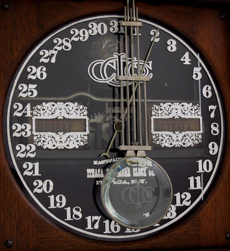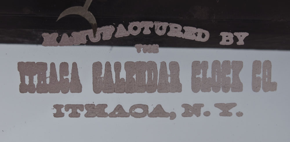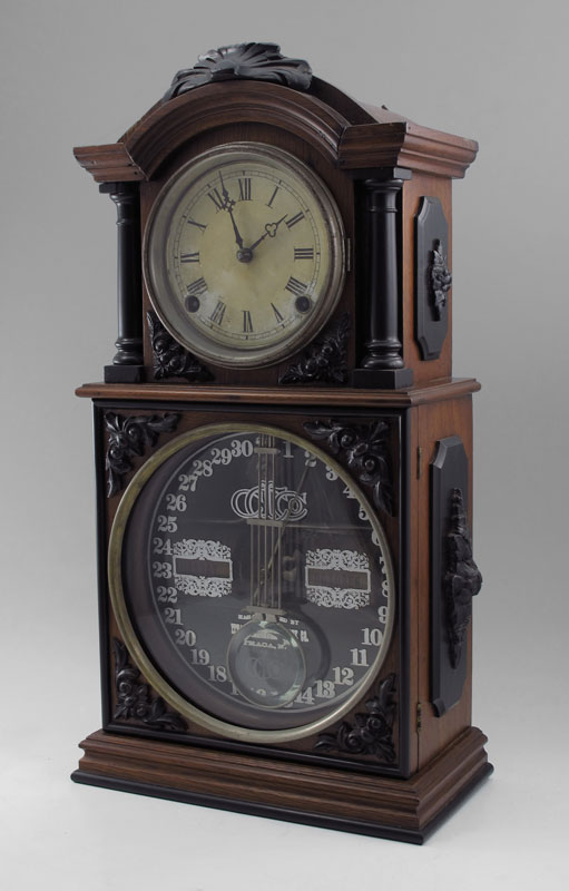 ITHACA CALENDAR CLOCK CO. DUAL DIAL SHELF CLOCK: Walnut case with carved wood accents and full column supports on top half. Top dial with paper face, bottom dial clear glass face and marked Ithaca Calendar Clock Co.. Time and strike movement with lower dial featuring date, day and month movements. Key and etched glass pendulum in office. 19'' h. x 10 1/4'' x 5 3/8''.